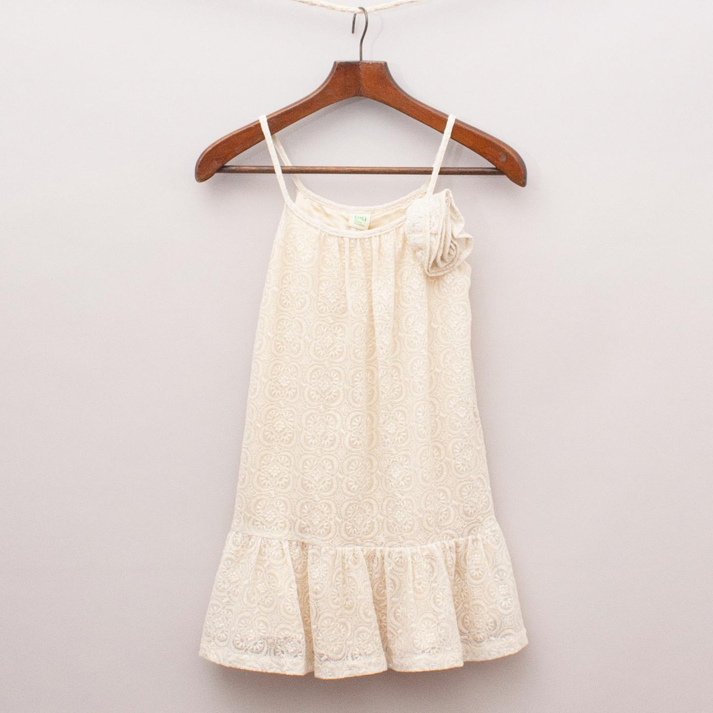 Fiona Scanlan metallic cream dress with lace overlay, ruffled hemline, fully lined with fabric flower detail on the front