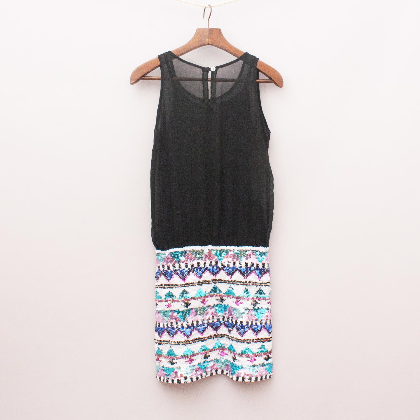 Flowers by Zoe sheer black dress, fully lined with coloured sequin skirt and single button back closure
