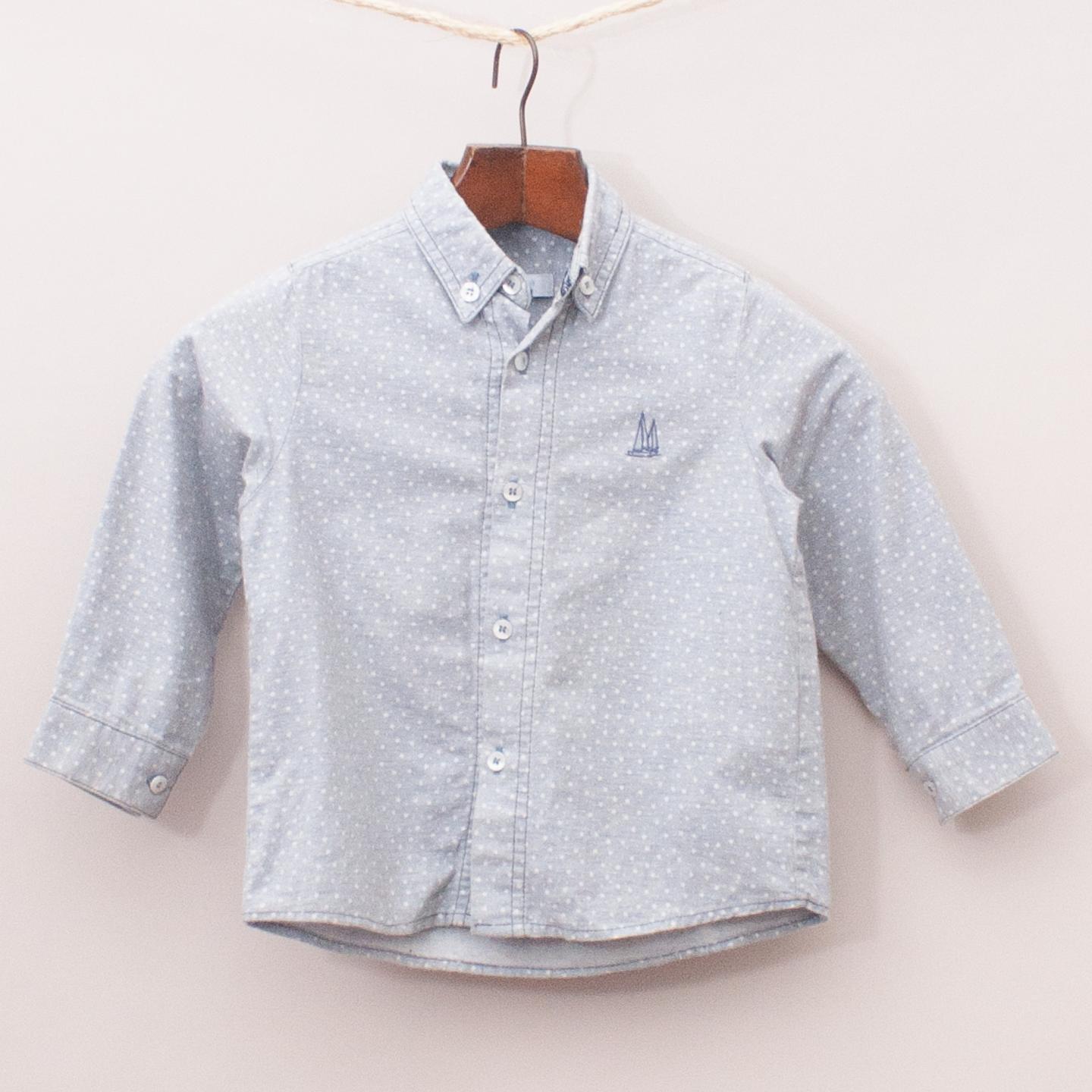 Foque grey and star patterned long sleeve shirt with small embroidered sail boat on the front and full button down front *100% Cotton