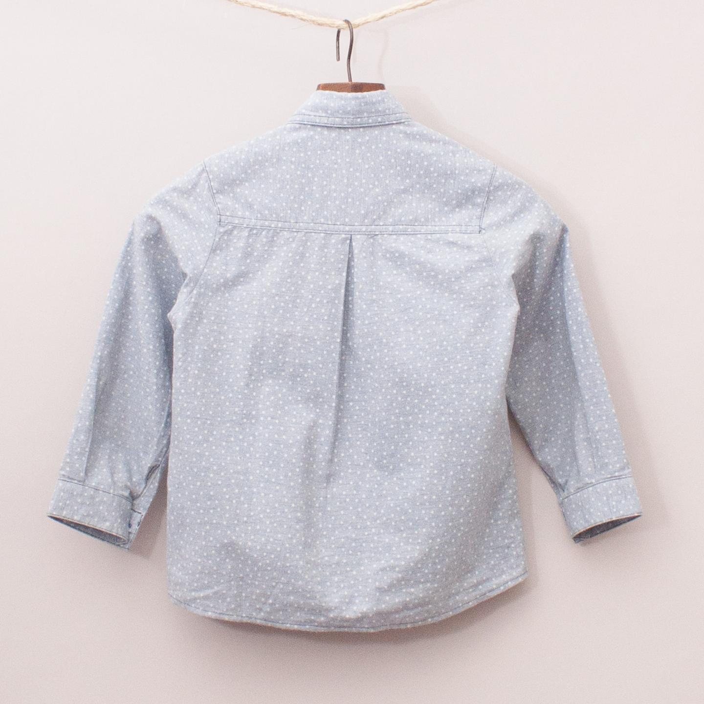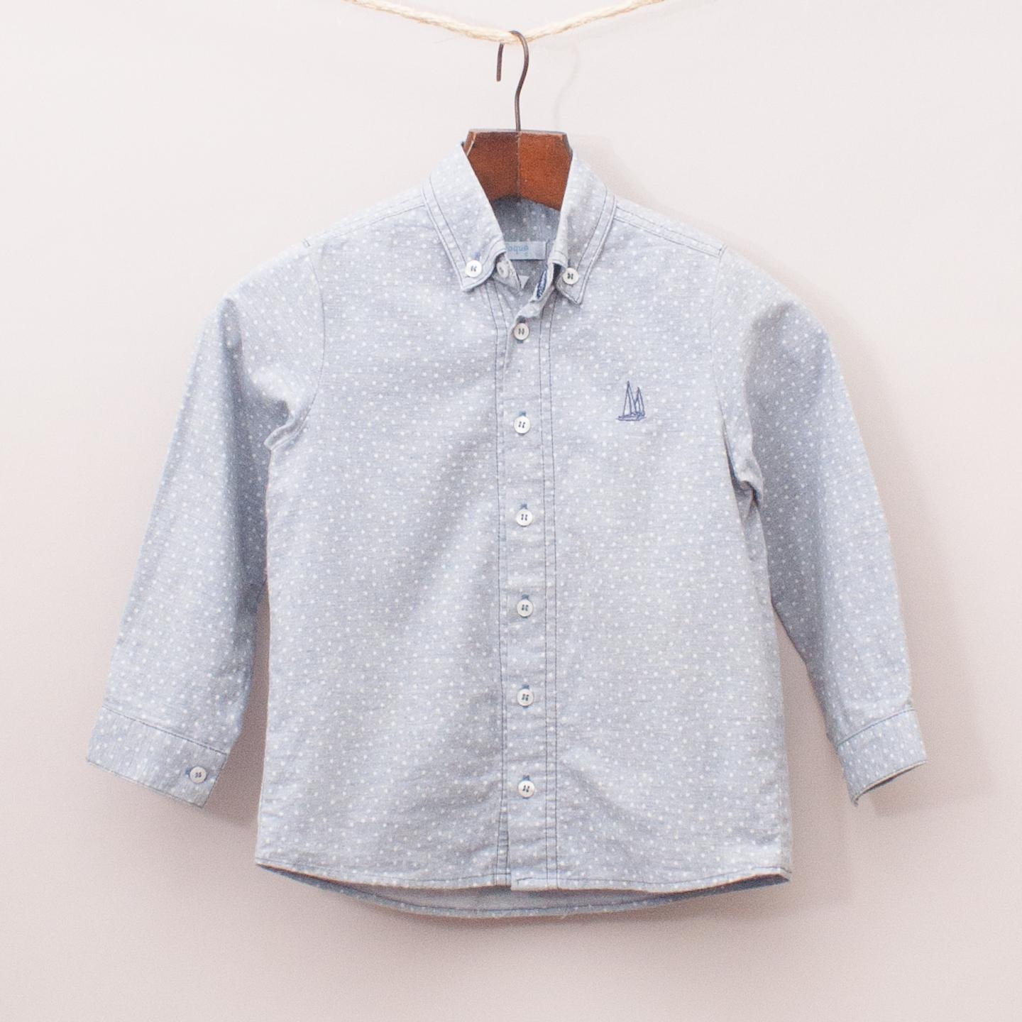 Foque grey and star patterned long sleeve shirt with small embroidered sail boat on the front and full button down front *100% Cotton