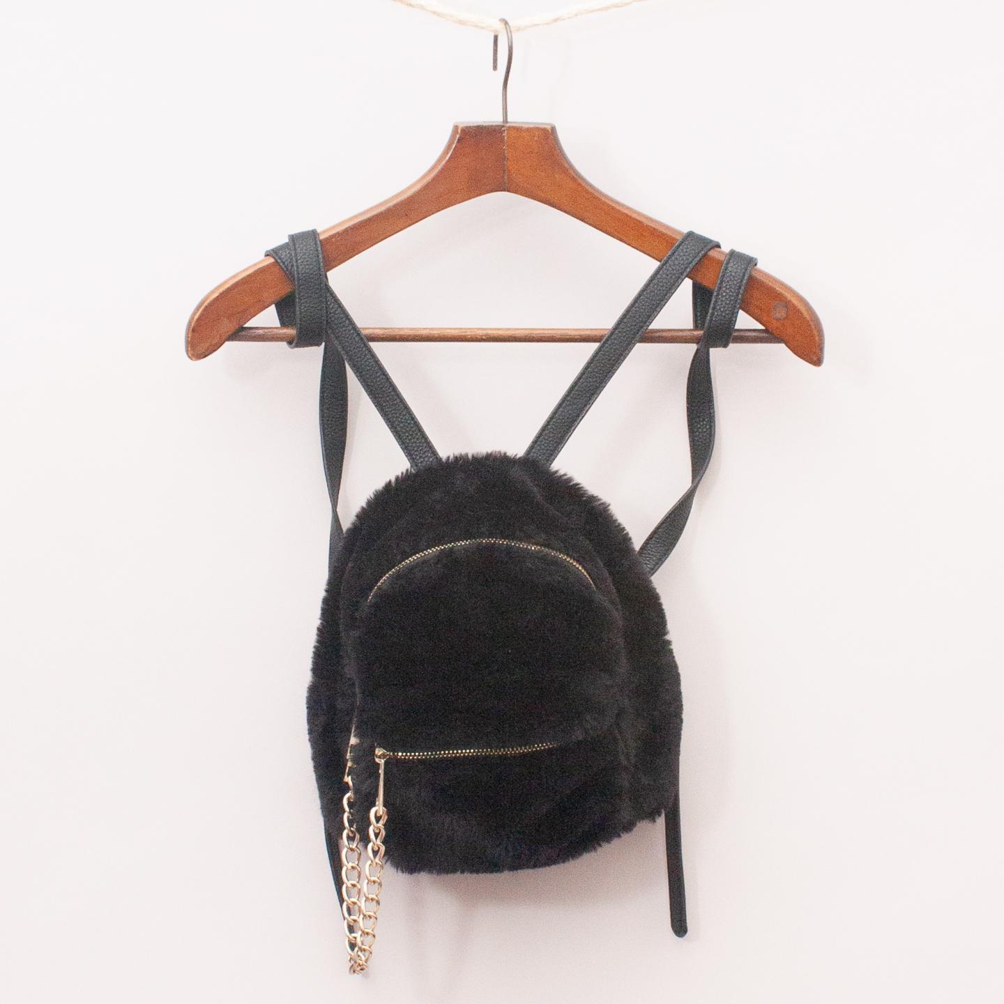 Forever 21 black faux fur backpack with gold hardware, two compartments and adjustable straps