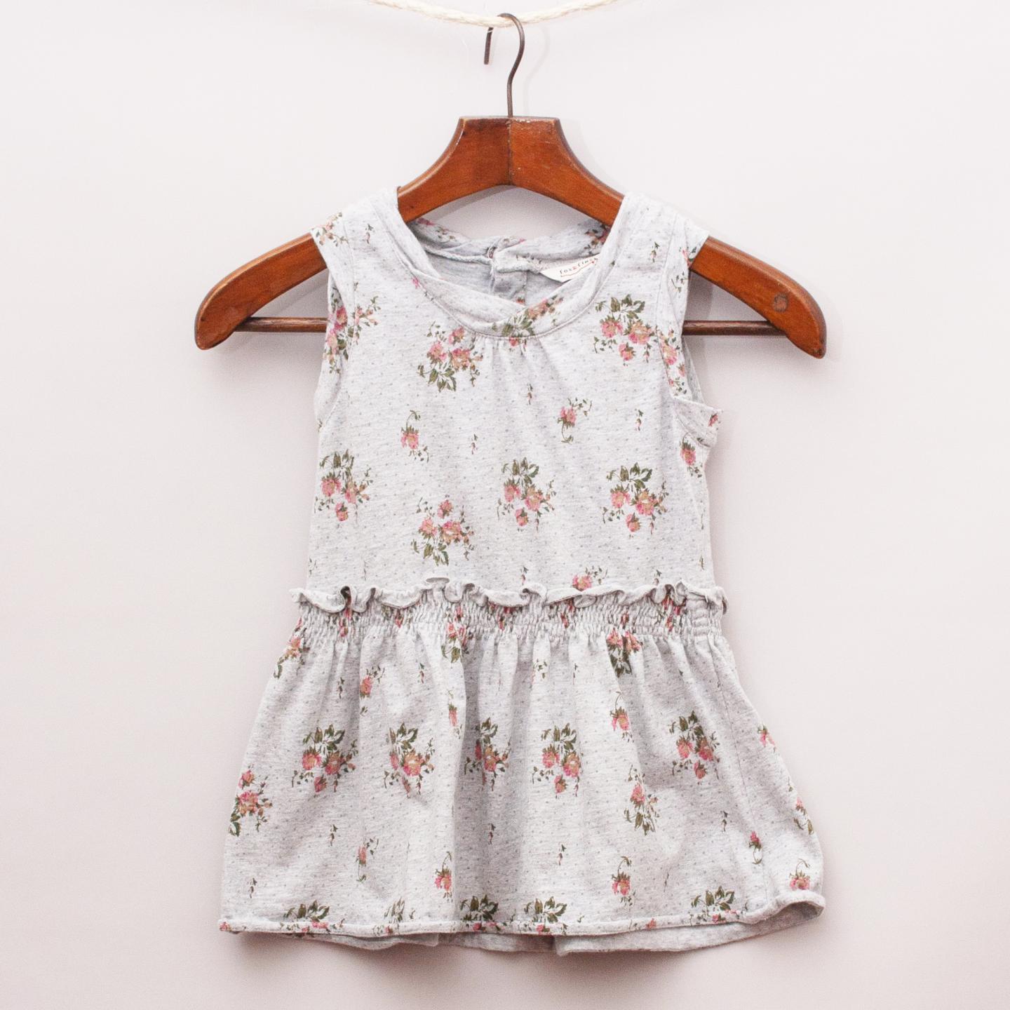 Fox & Finch grey dress with floral pattern throughout, ruffled elastic waistband, rolled neckline and sleeves and two button back closure