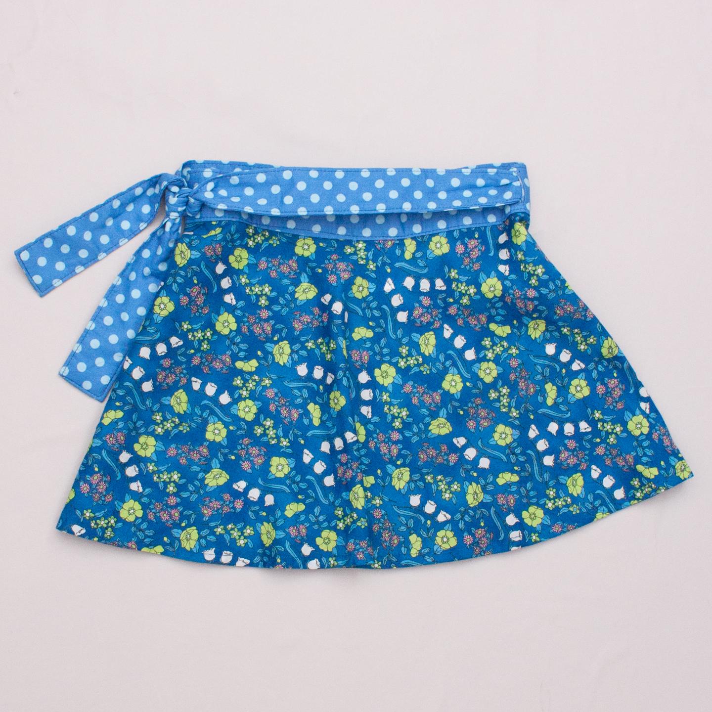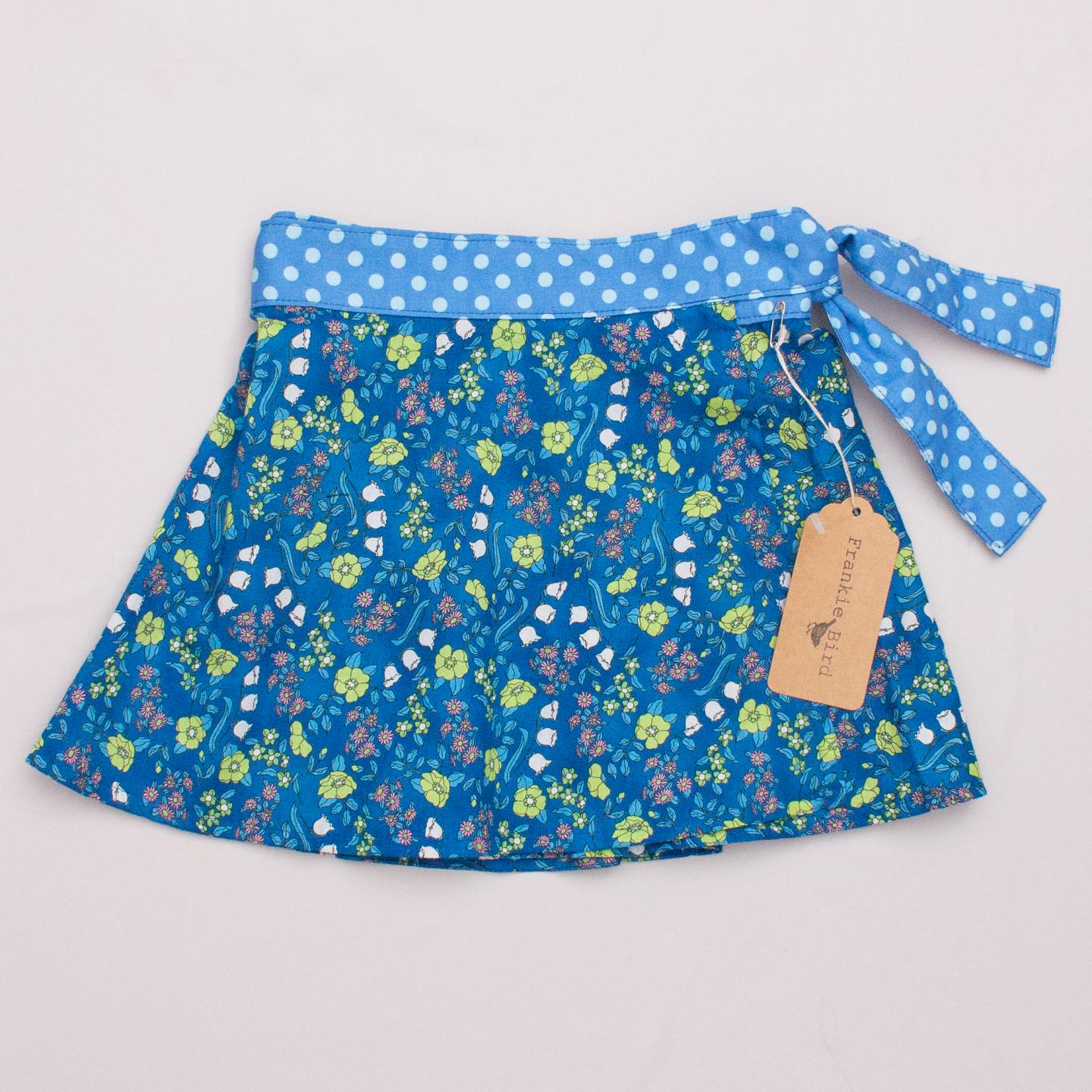 Frankie Bird "brand new with tags" blue and yellow floral patterned cross-over skirt with polka dot waist tie