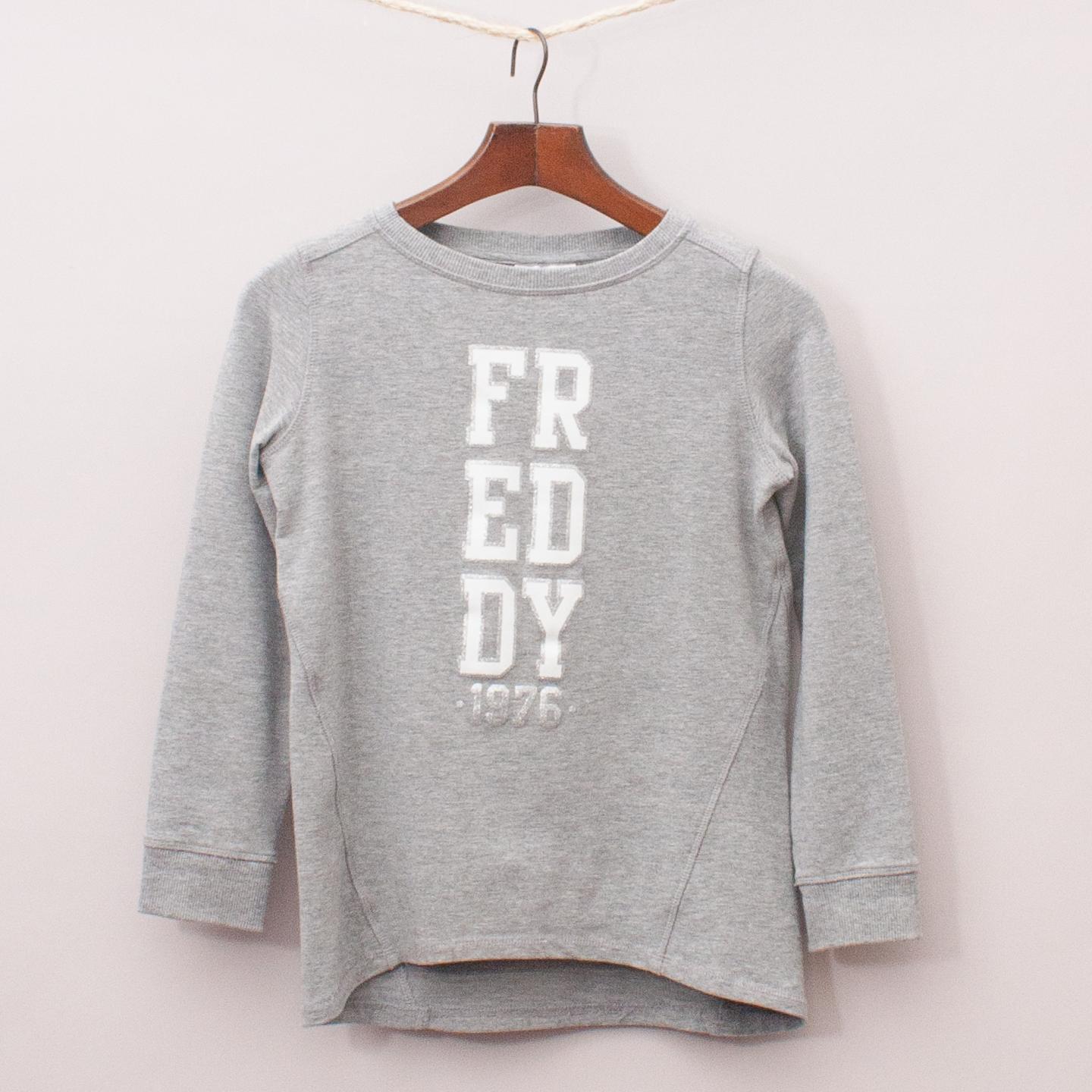 Freddy grey sweatshirt with printed logo down the front and ribbed neckline, cuffs and hemline *80% Cotton, 20% Elastane