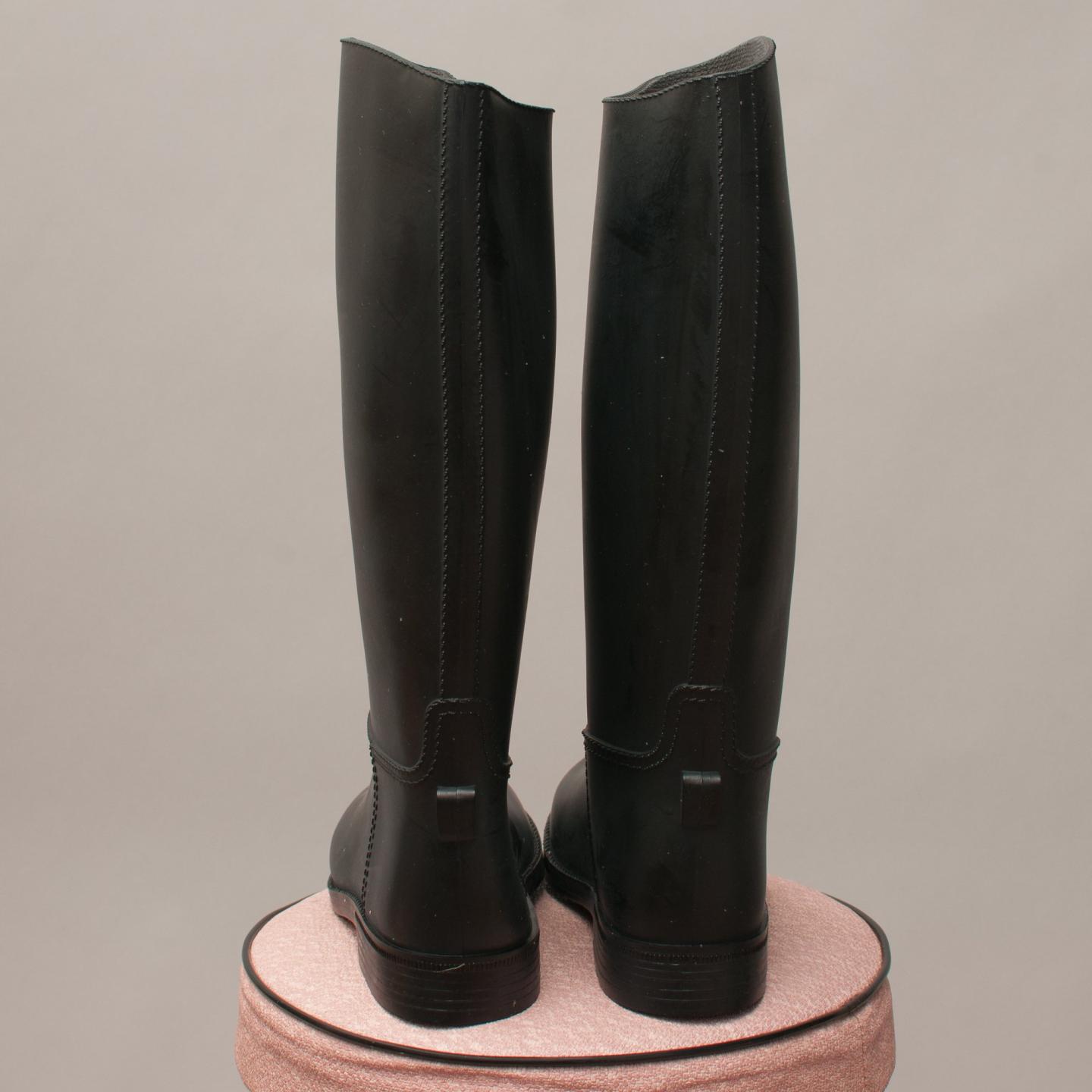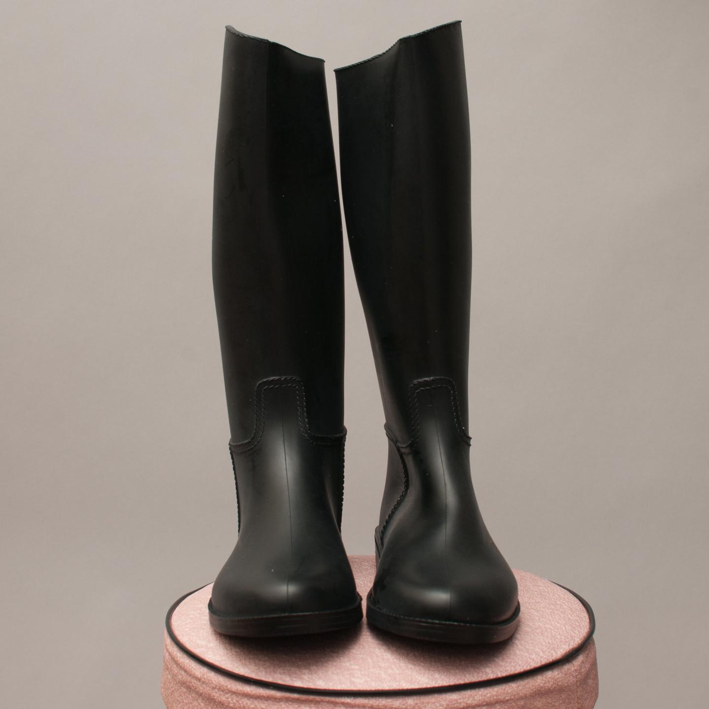 Black up to the knee length sleek, sturdy rubber gumboots, rounded pointed toe with exposed look stitching - Size EU 31 (Age 6 Approx.)