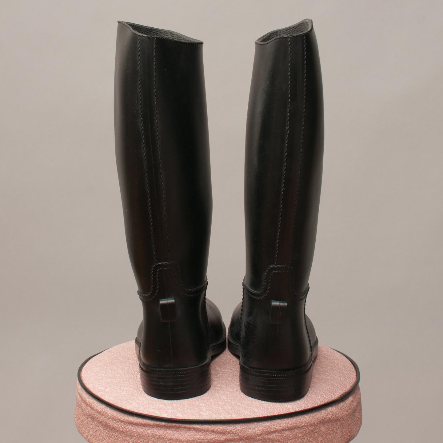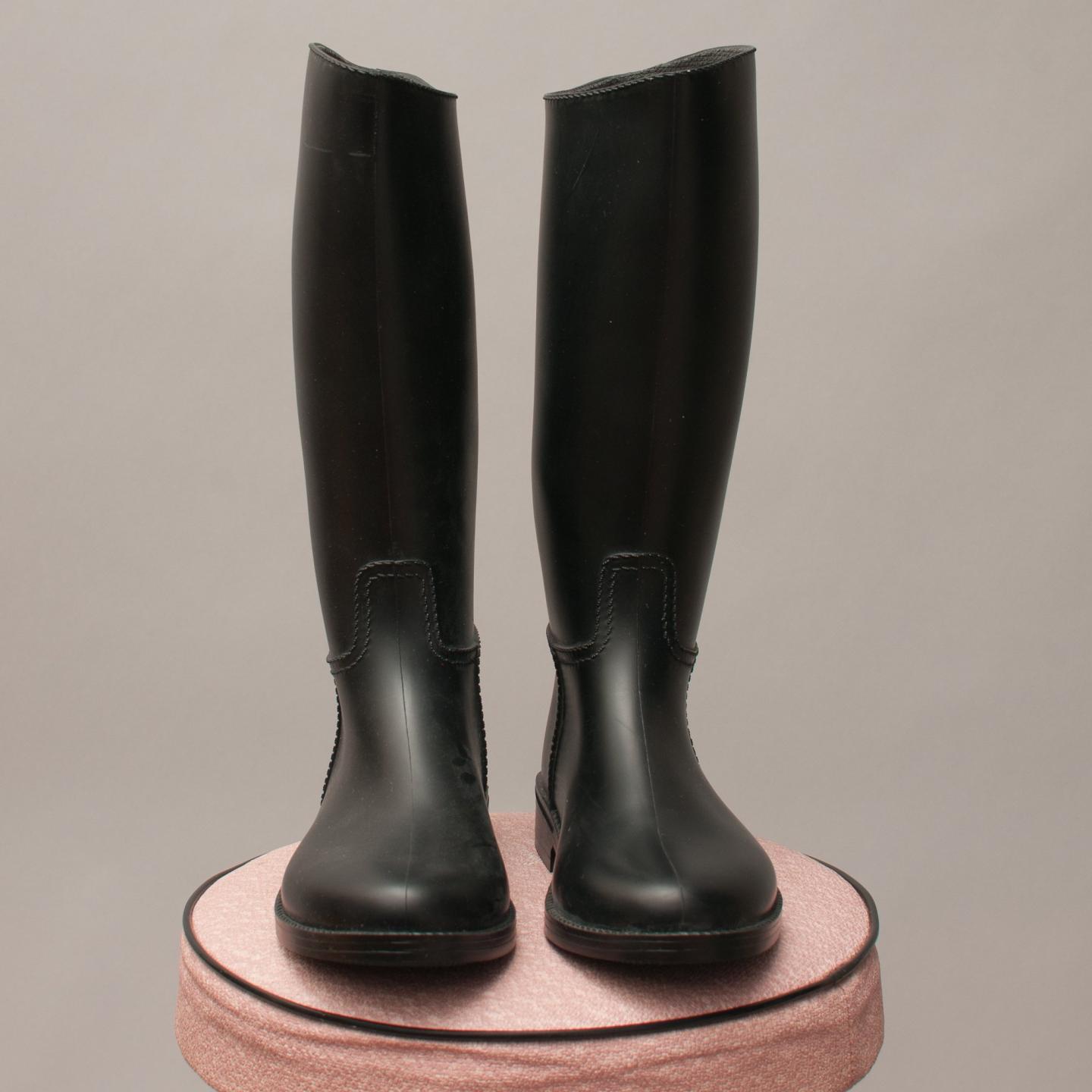 Black up to the knee length sleek, sturdy rubber gumboots, rounded pointed toe with exposed look stitching - Size EU 28 (Age 4 Approx.)