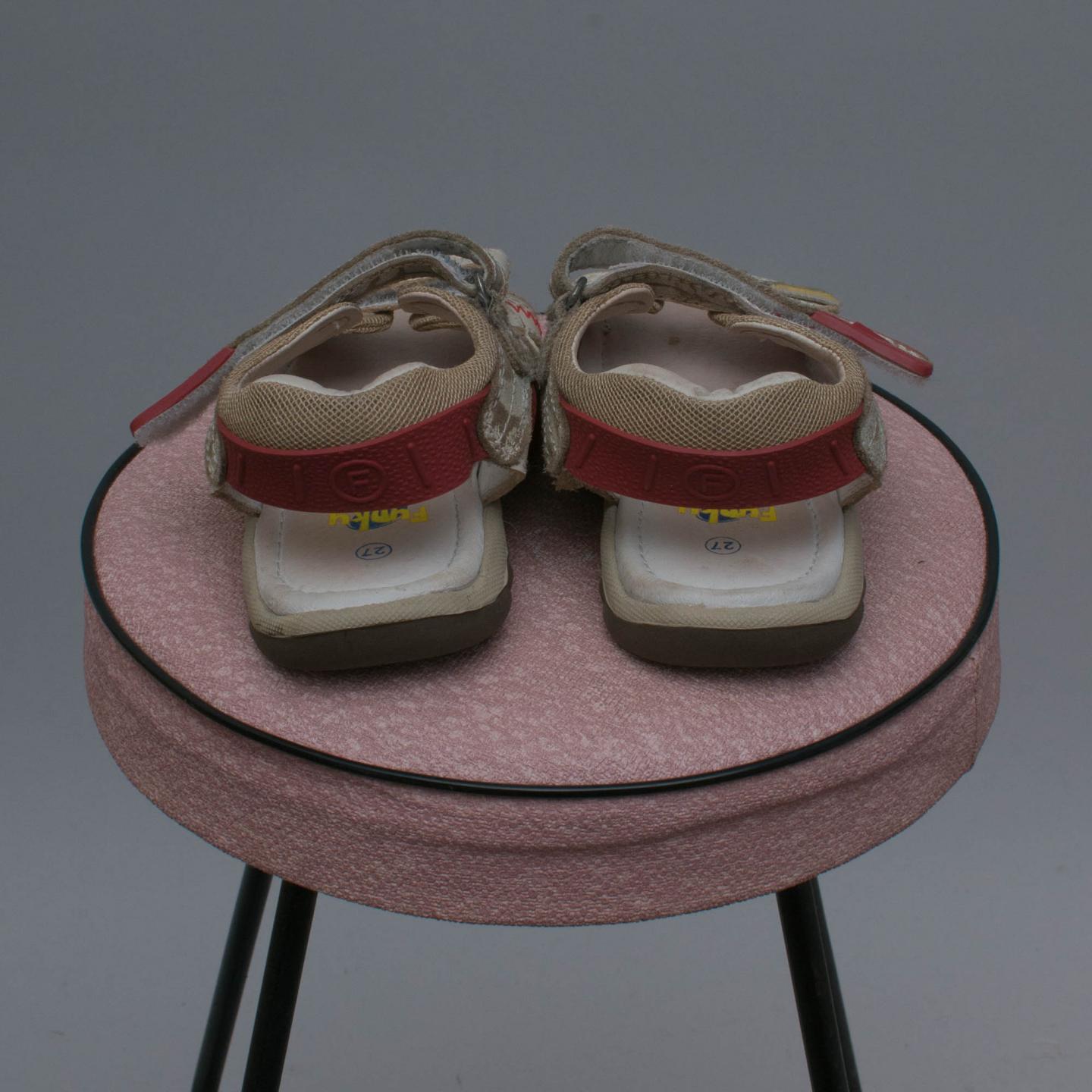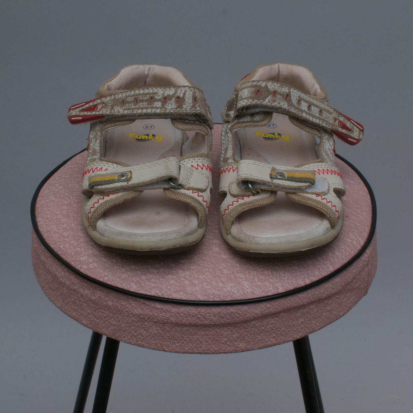 Funky beige and red leather sandals with red stitching details, velcro strap closures and sturdy rubber sole (Age 3 Approx.)