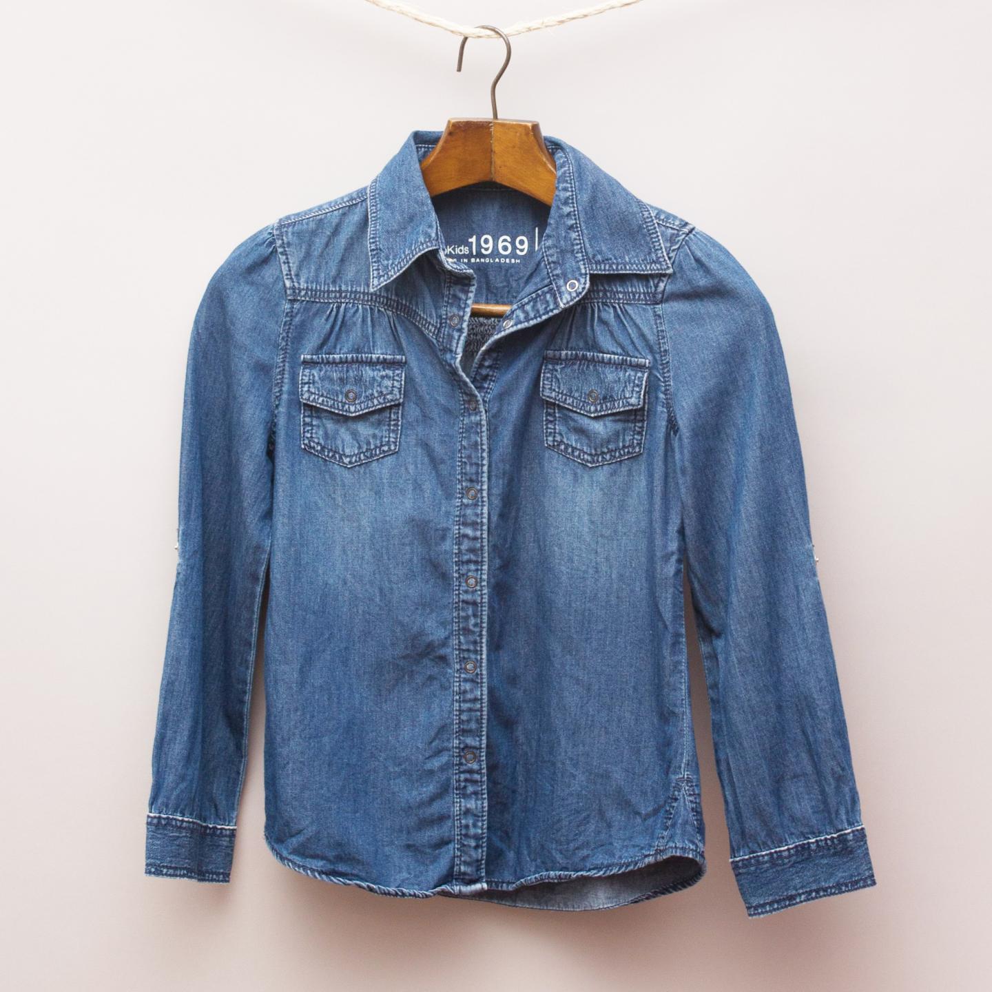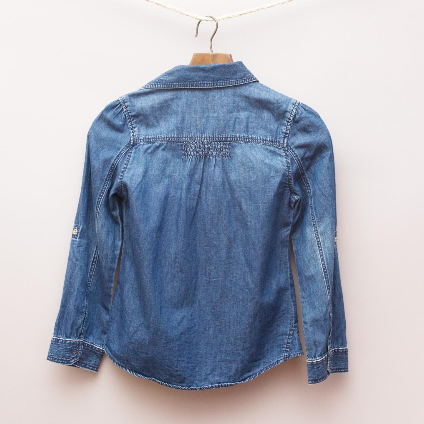 Gap navy blue denim shirt with two front pockets, gathered shoulder details and full button down front