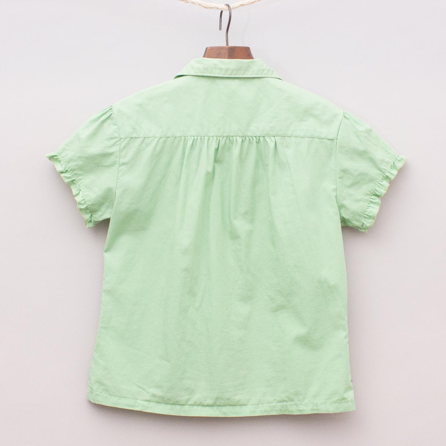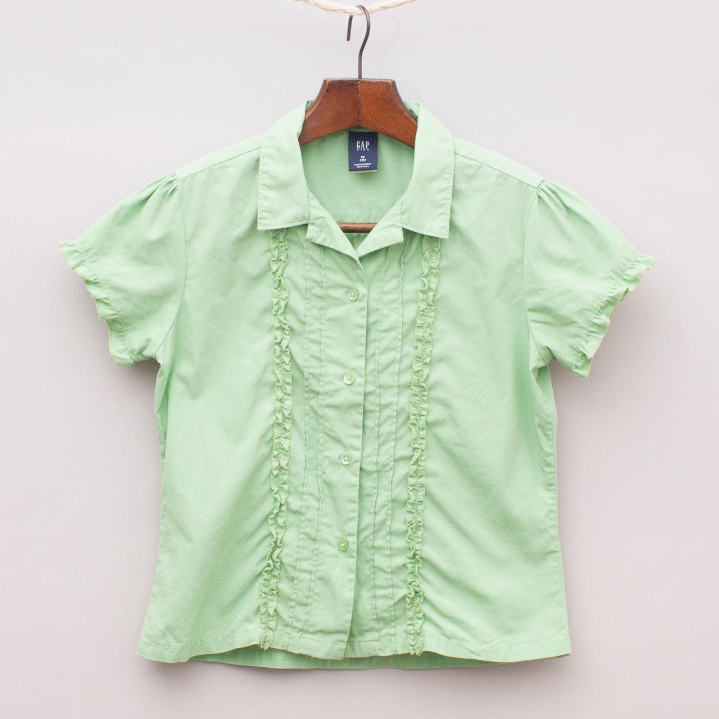 Gap green short sleeve shirt with ruffle details throughout, puffed sleeves and full button down front