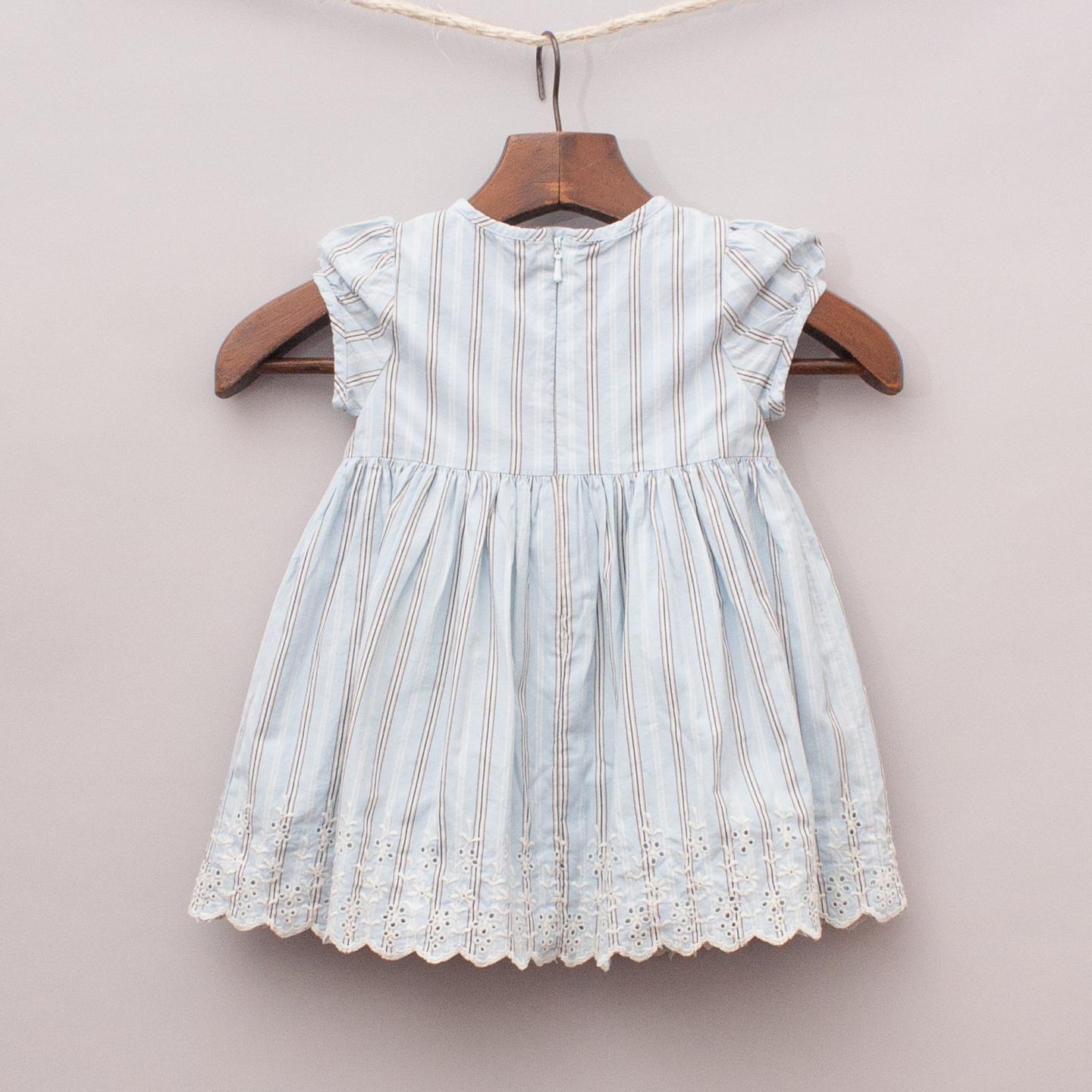 Gap pastel blue and white pin striped dress with puffy sleeves, gathered waistline, broderie anglaise hemline with full zip back closure