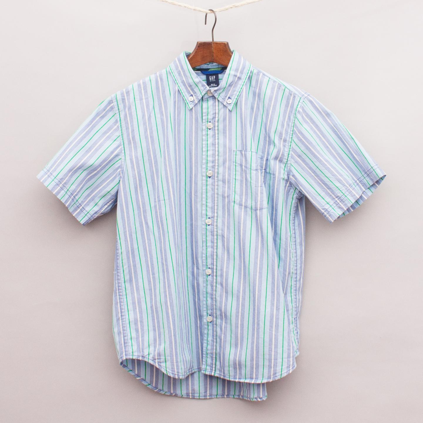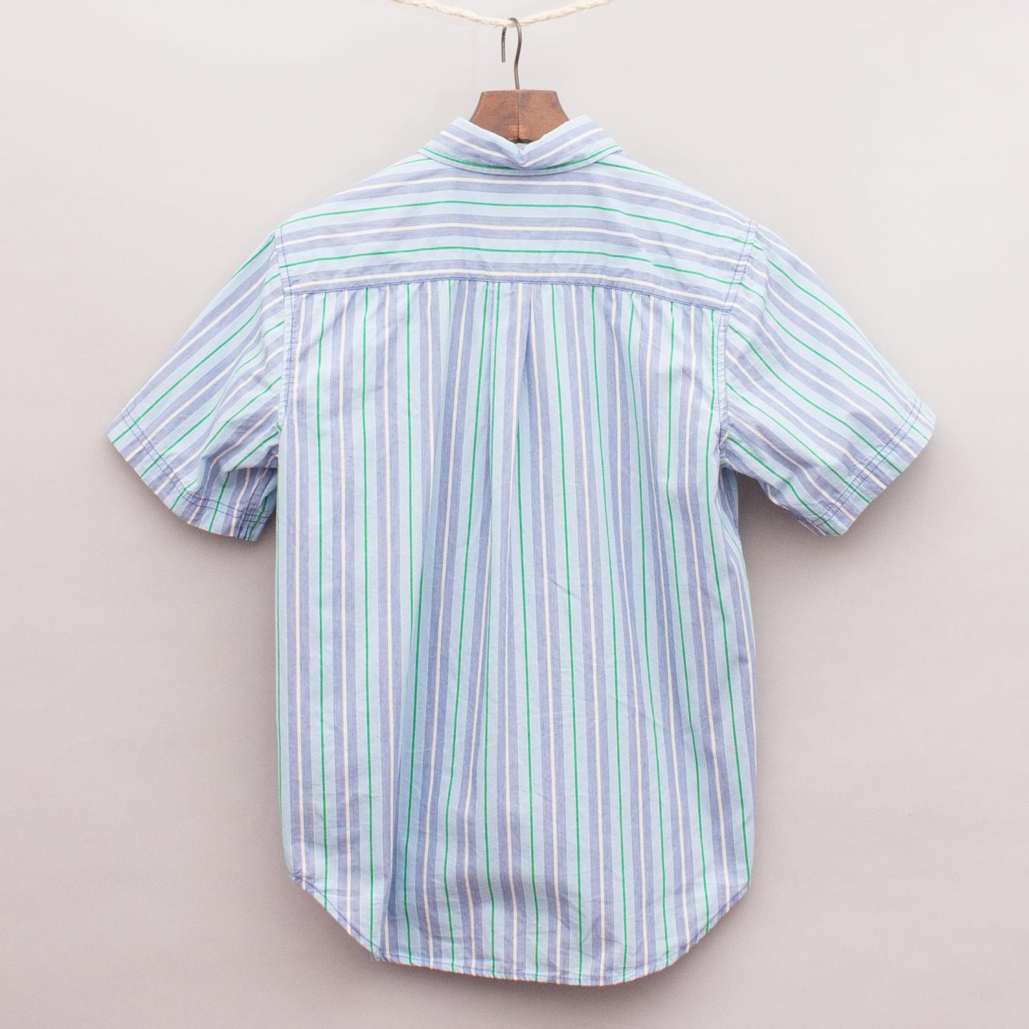 Gap light blue, white and green striped short sleeve shirt with single front pocket and full button down front