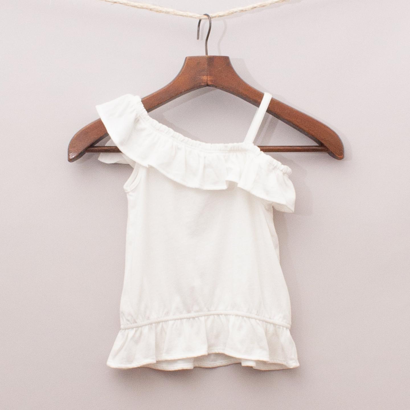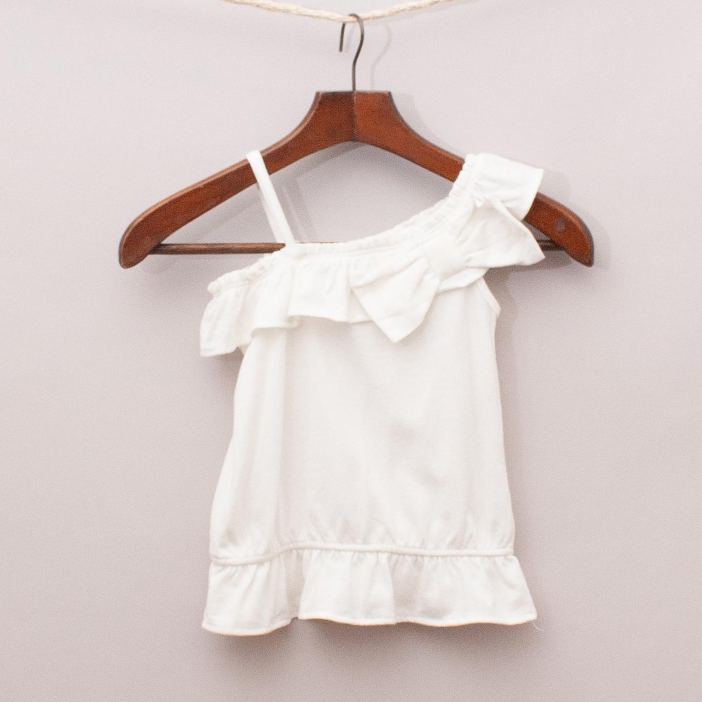 Gap white singlet top with ruffle neckline and waistband, off the shoulder style, bow detail at the front and elastic waistband