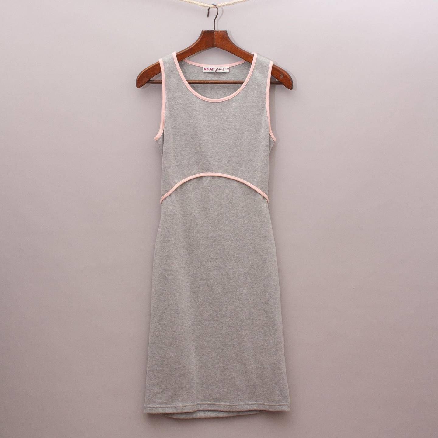 Gelati Jeans grey fitted dress with pastel pink trim and open cut out design at the back