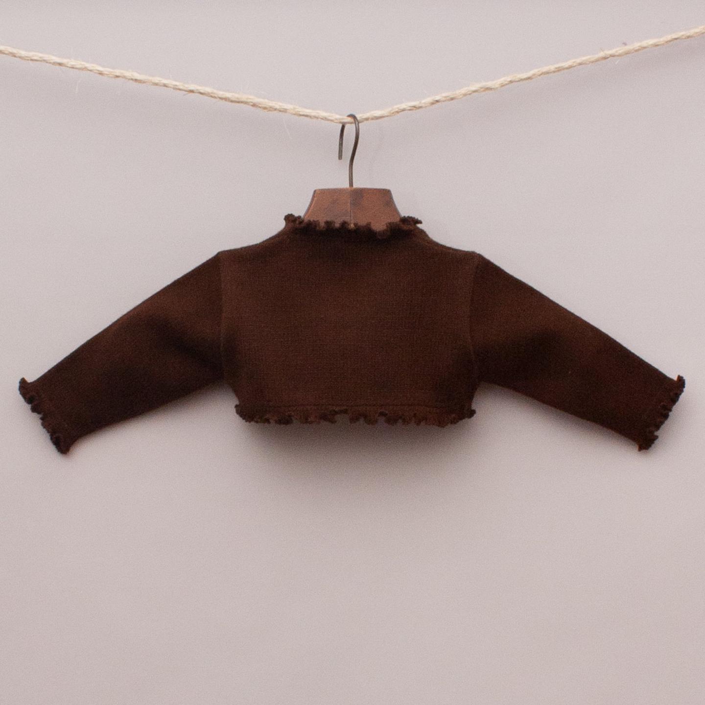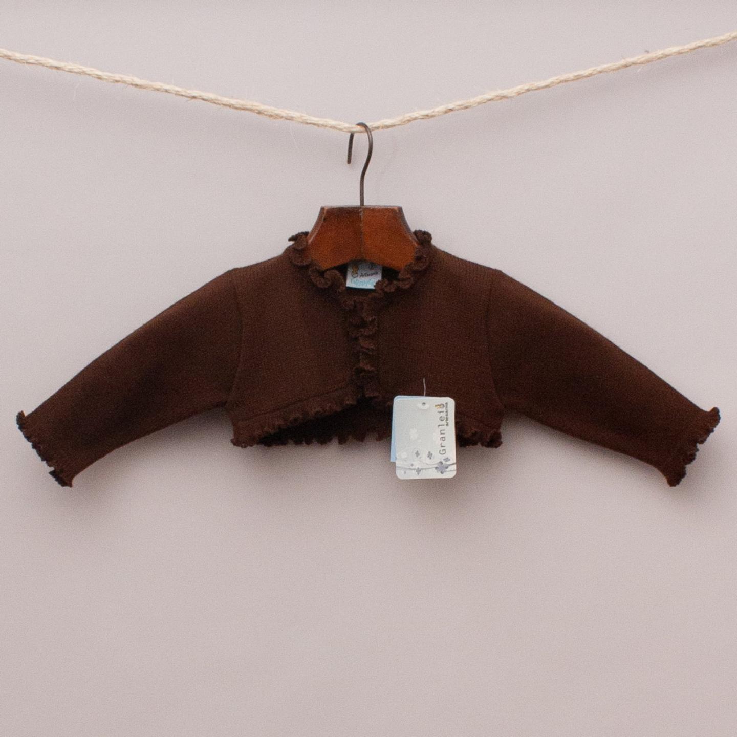 Granlei "brand new with tags" brown cropped cardigan with ruffle edge and hidden button closure