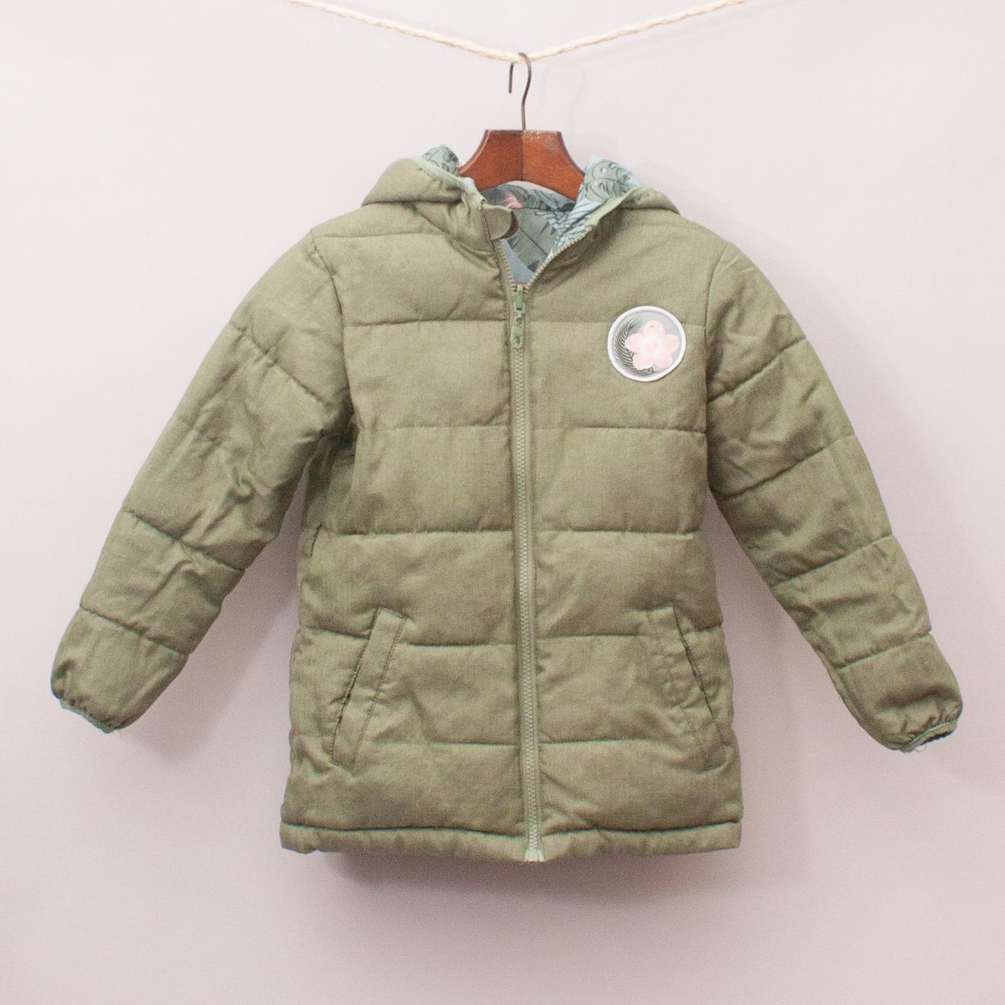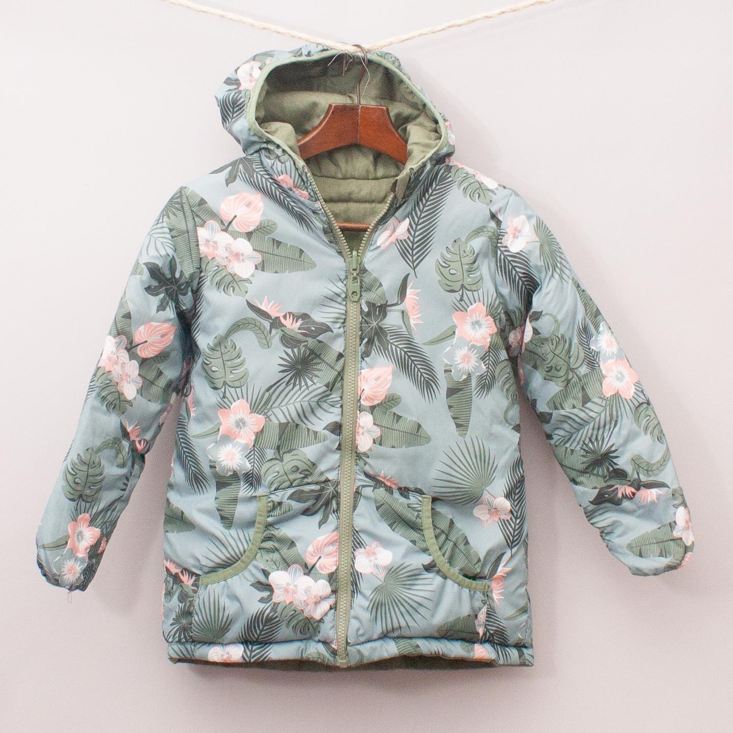 Green and floral patterned reversible hooded jacket with two front pockets and full zip up front