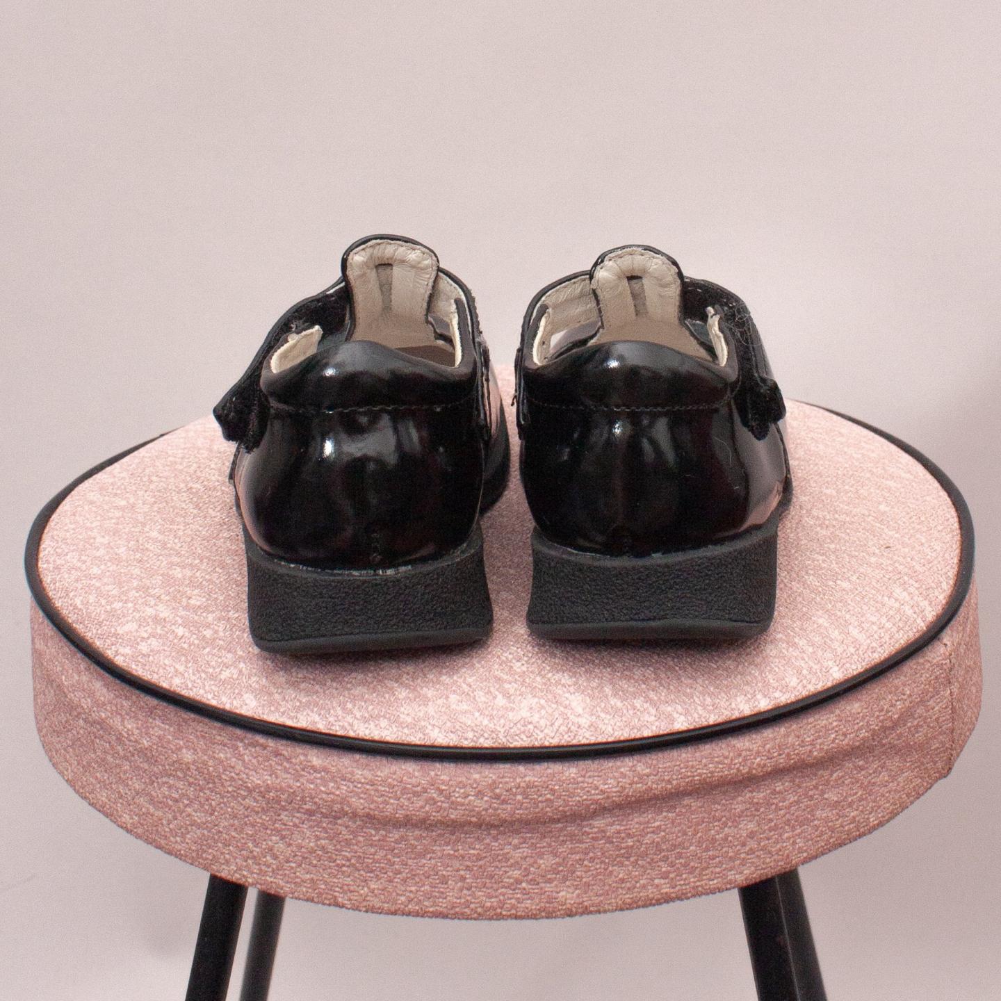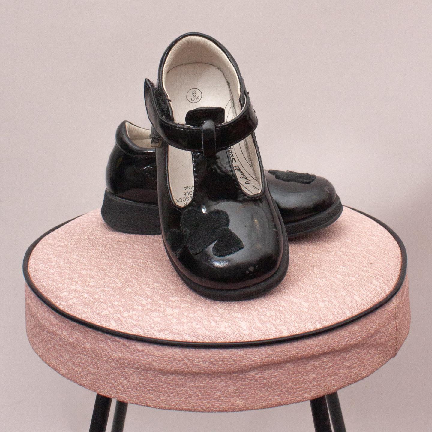 Gro-Shu black patent leather shoes with hearts on the front and single velcro strap - Size UK 6 (0-12Mths Approx.) *Some scuffs at the front