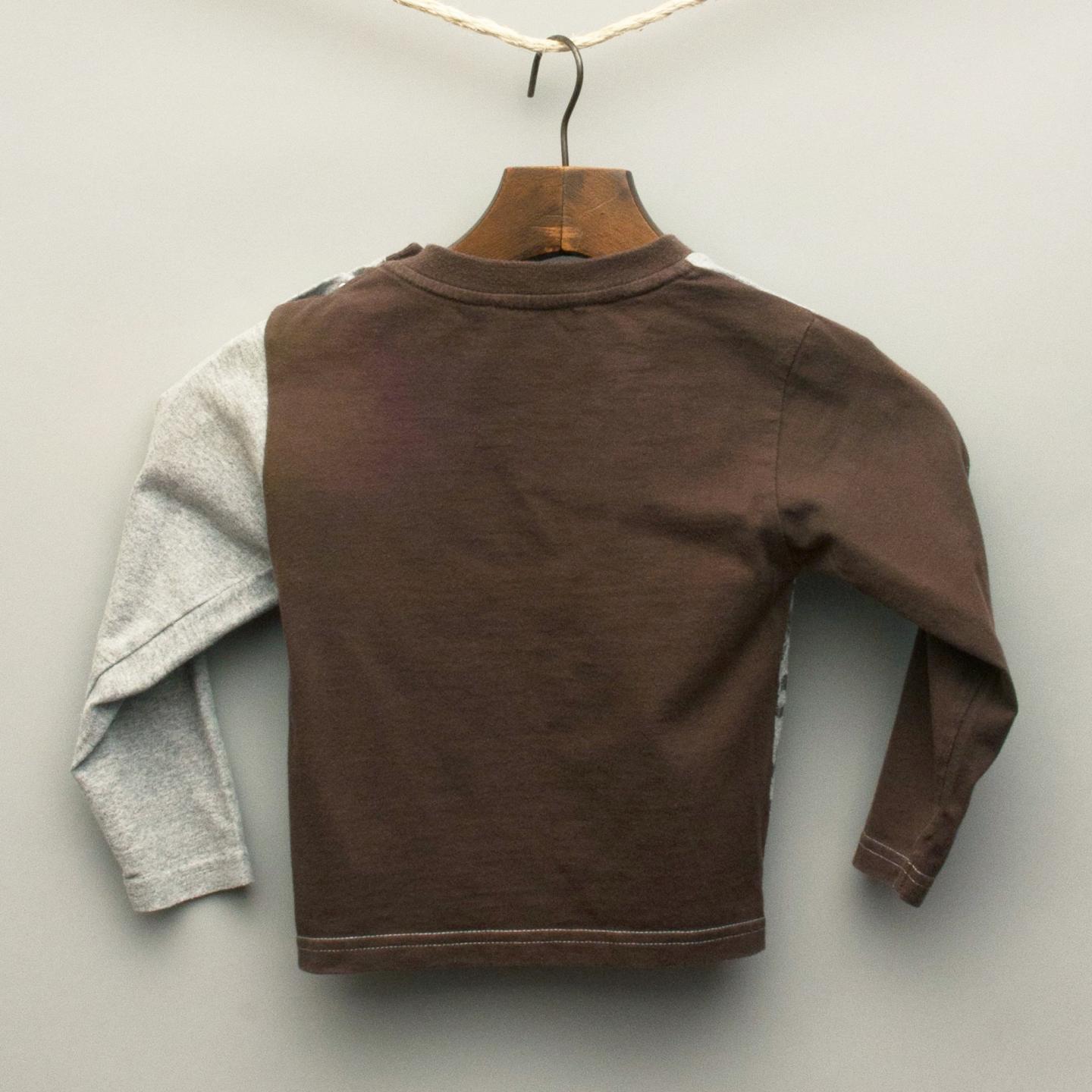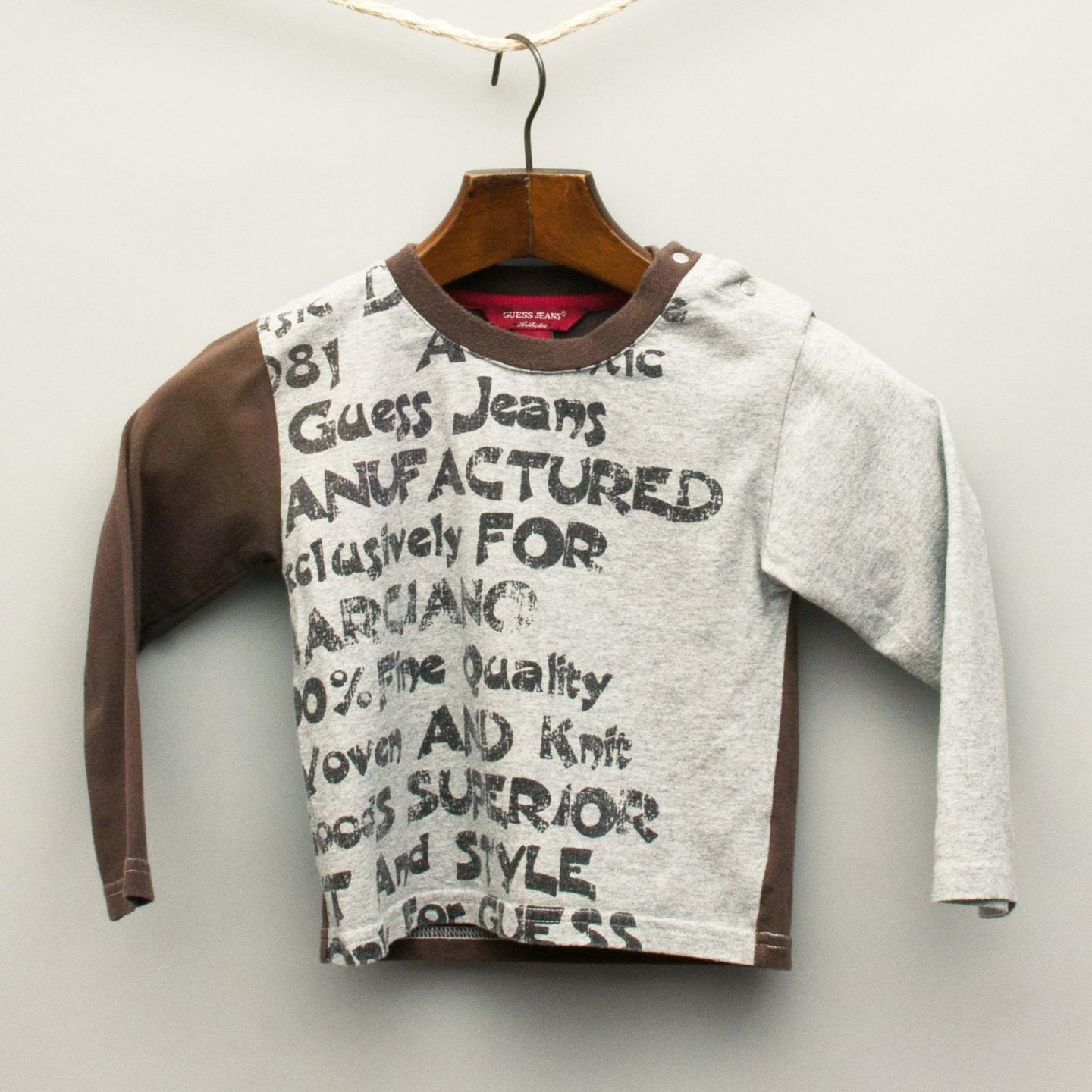 Guess Jeans brown and grey long sleeve top with writing detail on front and button shoulder fastening