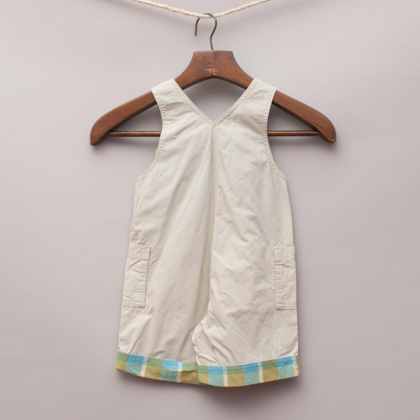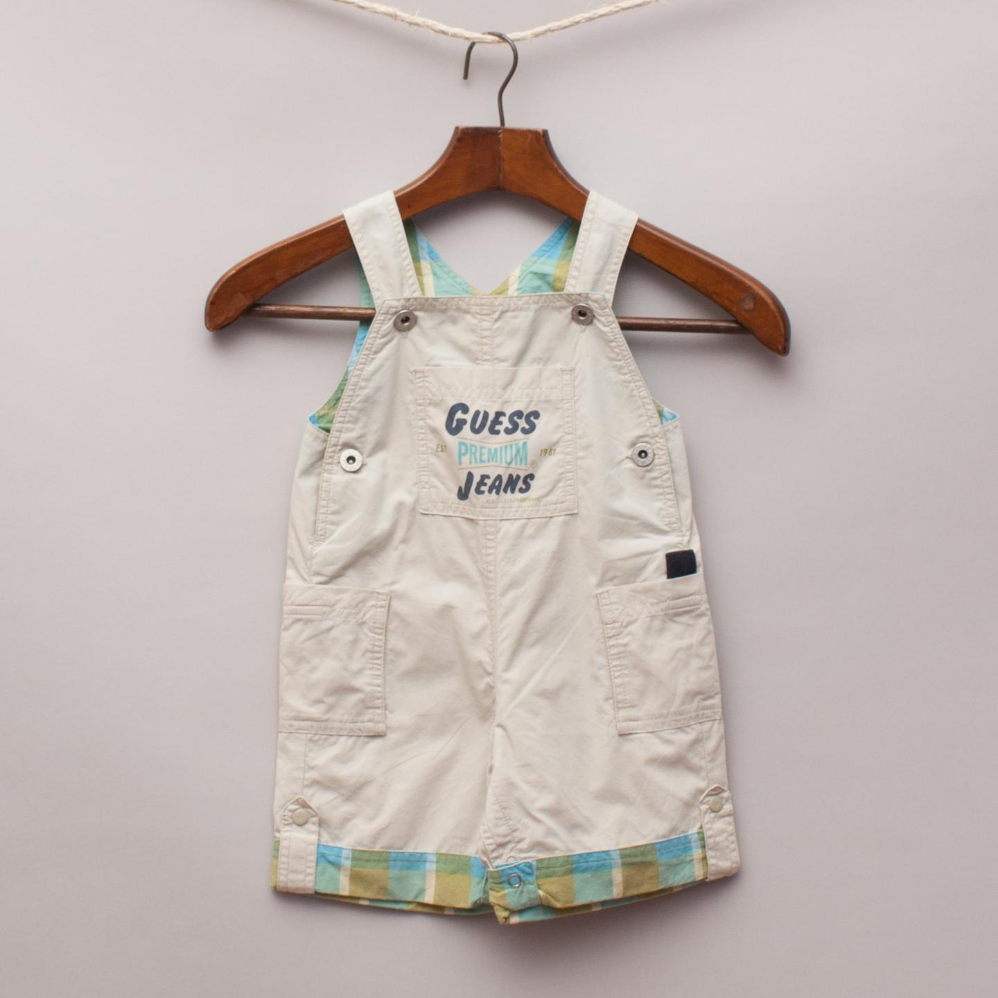 Guess cement coloured overalls with light blue, yellow and green check lining and cuffs, printed logo on front, multiple pocket details and button closures