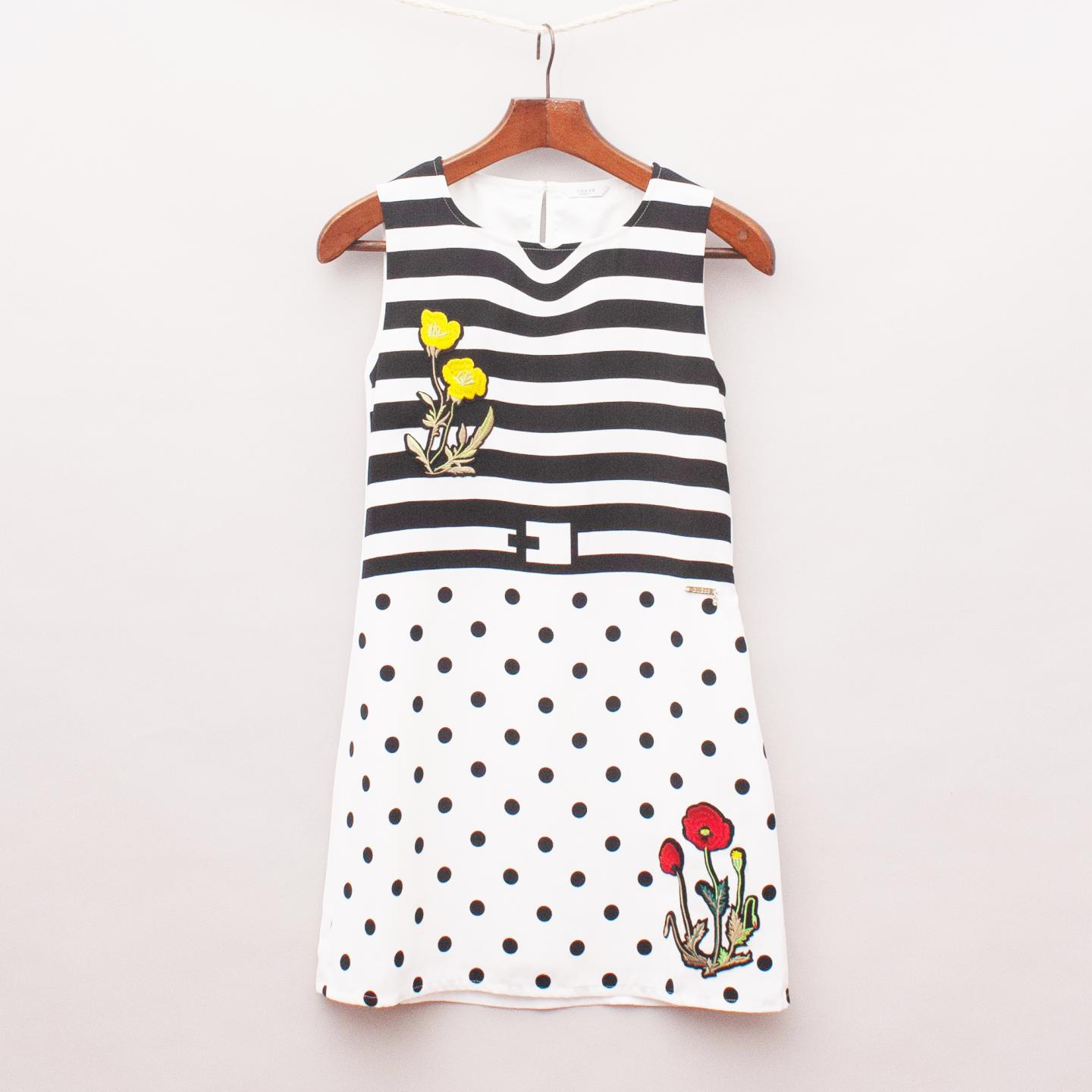 Guess "brand new with tags" white and black striped and polka dot print dress with embroidered flowers, side zip and single button back closure