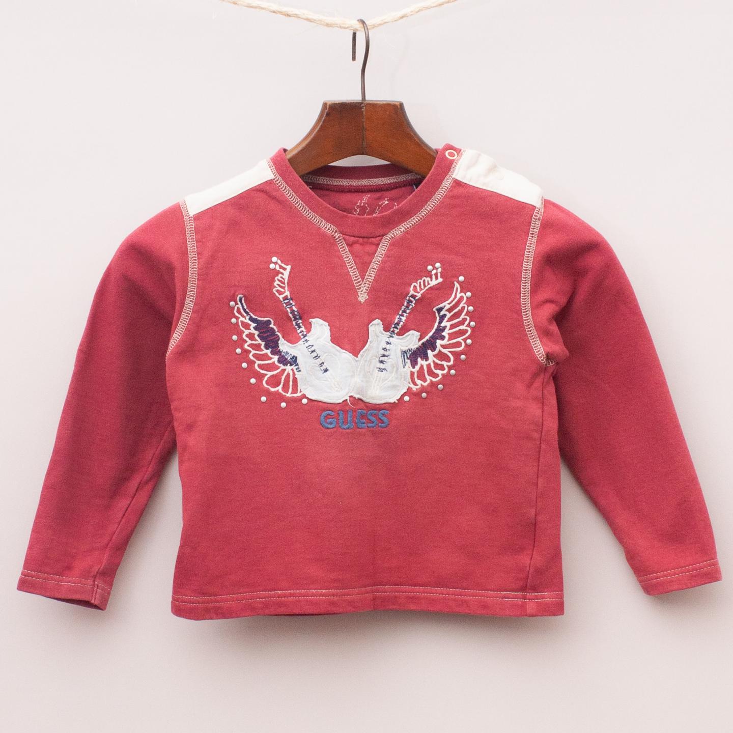 Guess red and cream long sleeve top with embroidered guitars on the front and shoulder button closure detail *100% Cotton