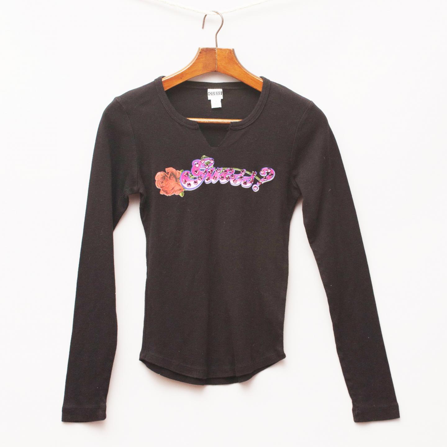 Guess black long sleeve top with small v-neck detail with printed logo with embellished details on the front