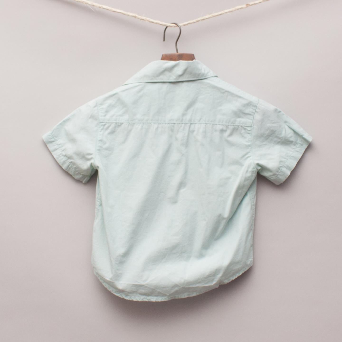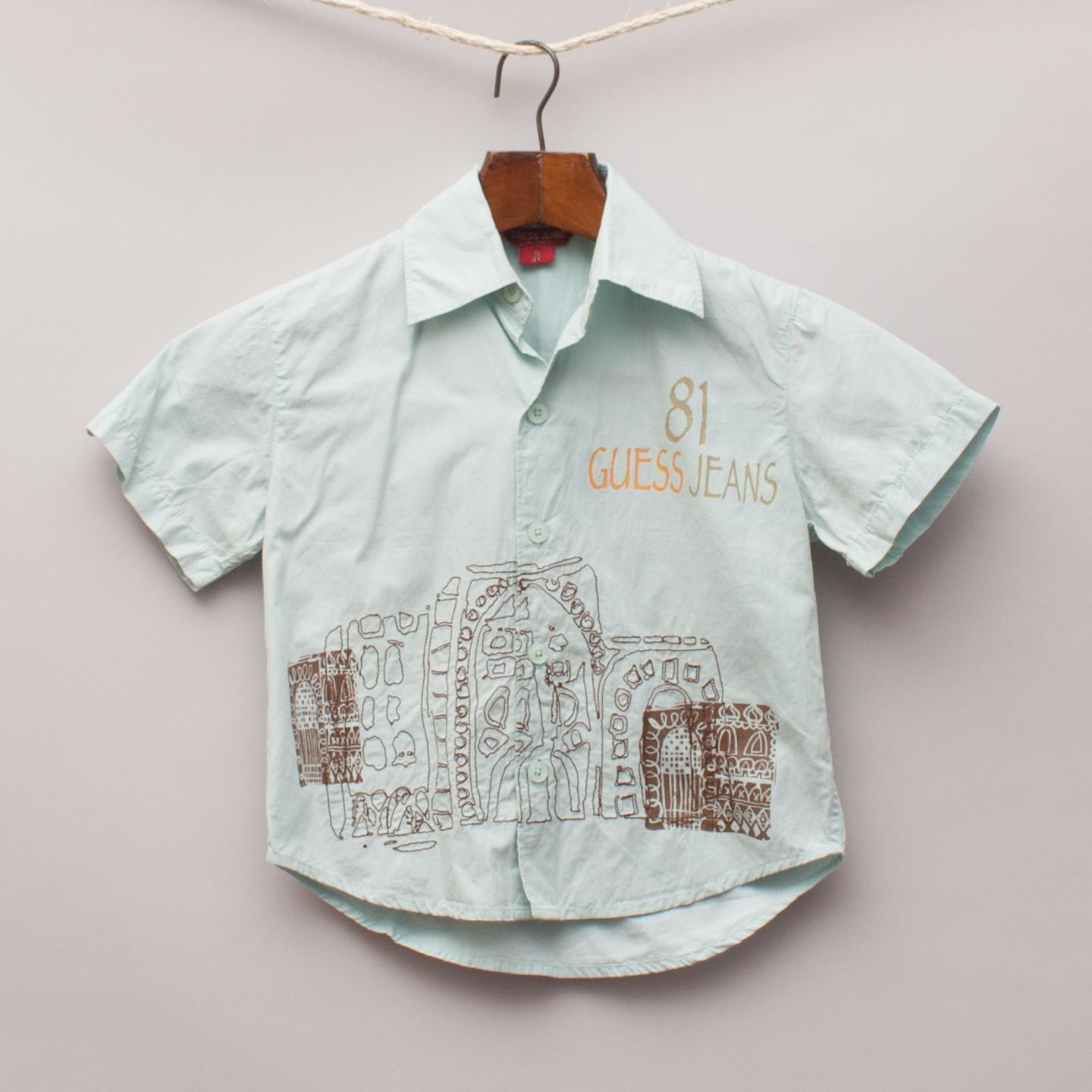 Guess light blue short sleeve shirt with printed and embroidered image on the front and full button down front