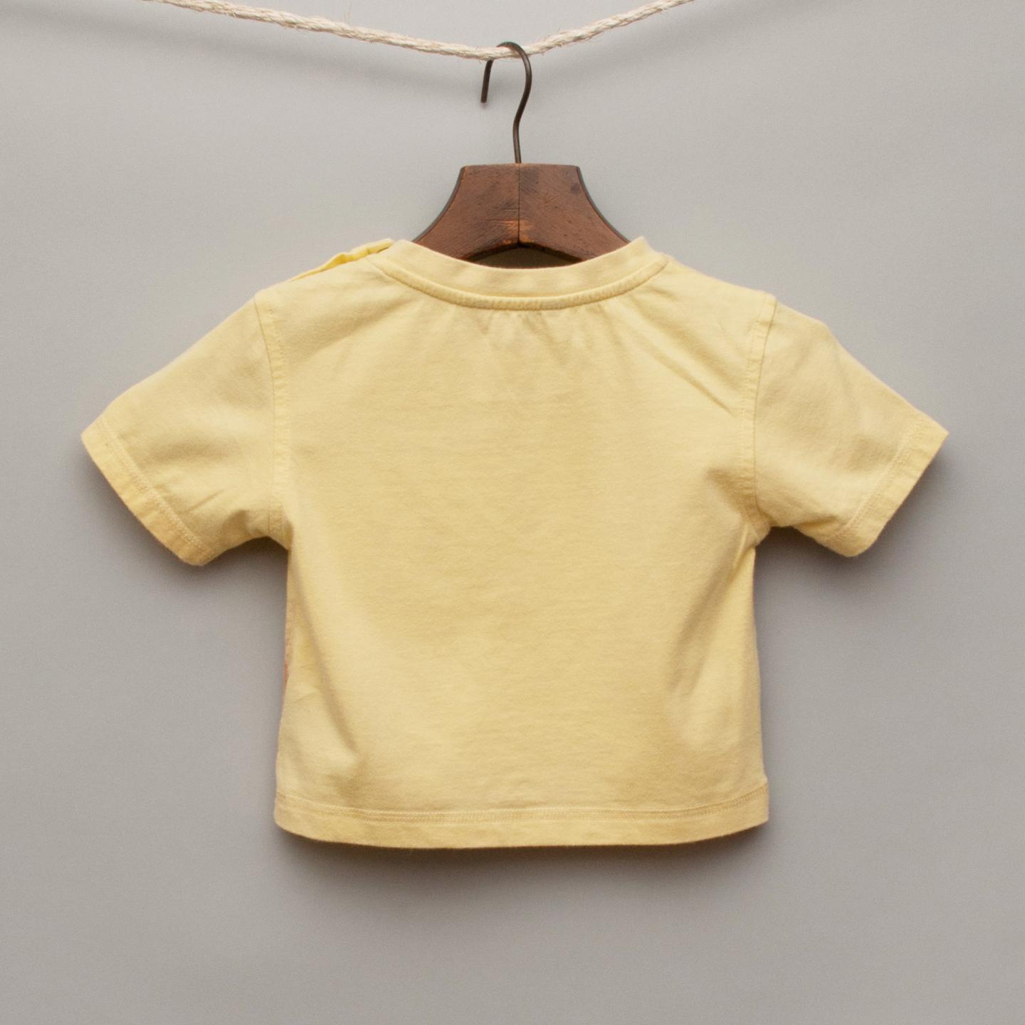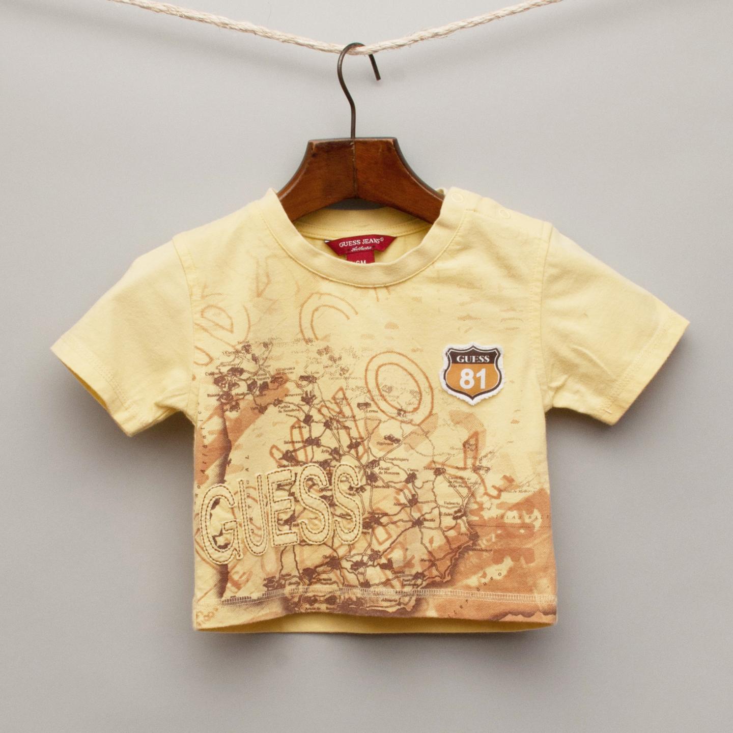 Guess yellow t-shirt with map drawing on front, patch, embroidered logo and shoulder button fastening