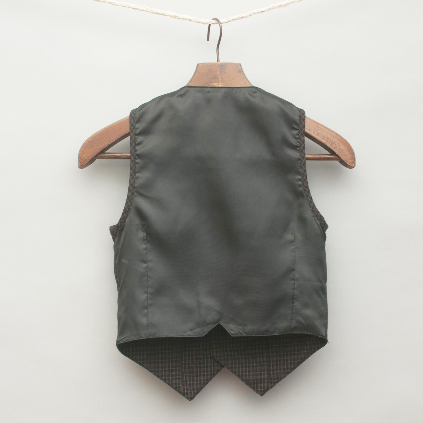 Gumboots brown plaid vest with pocket details on front, black satin look back, blazer style collar and full button fastening