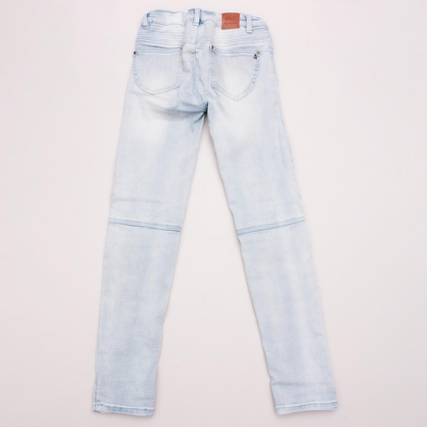 Gumboots distressed denim jeans with embroidered stitching detail, front and back pockets, belt loops and button/zip fastening
