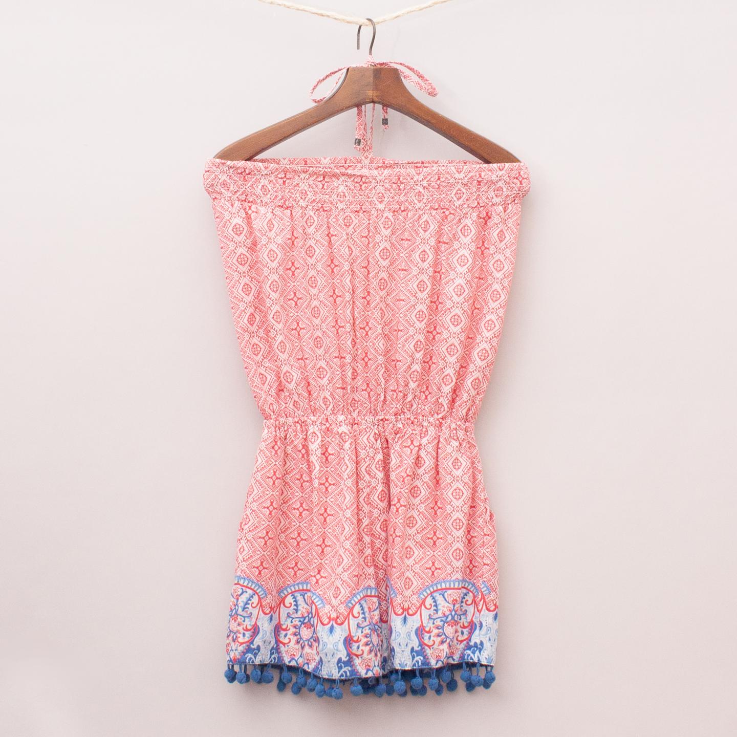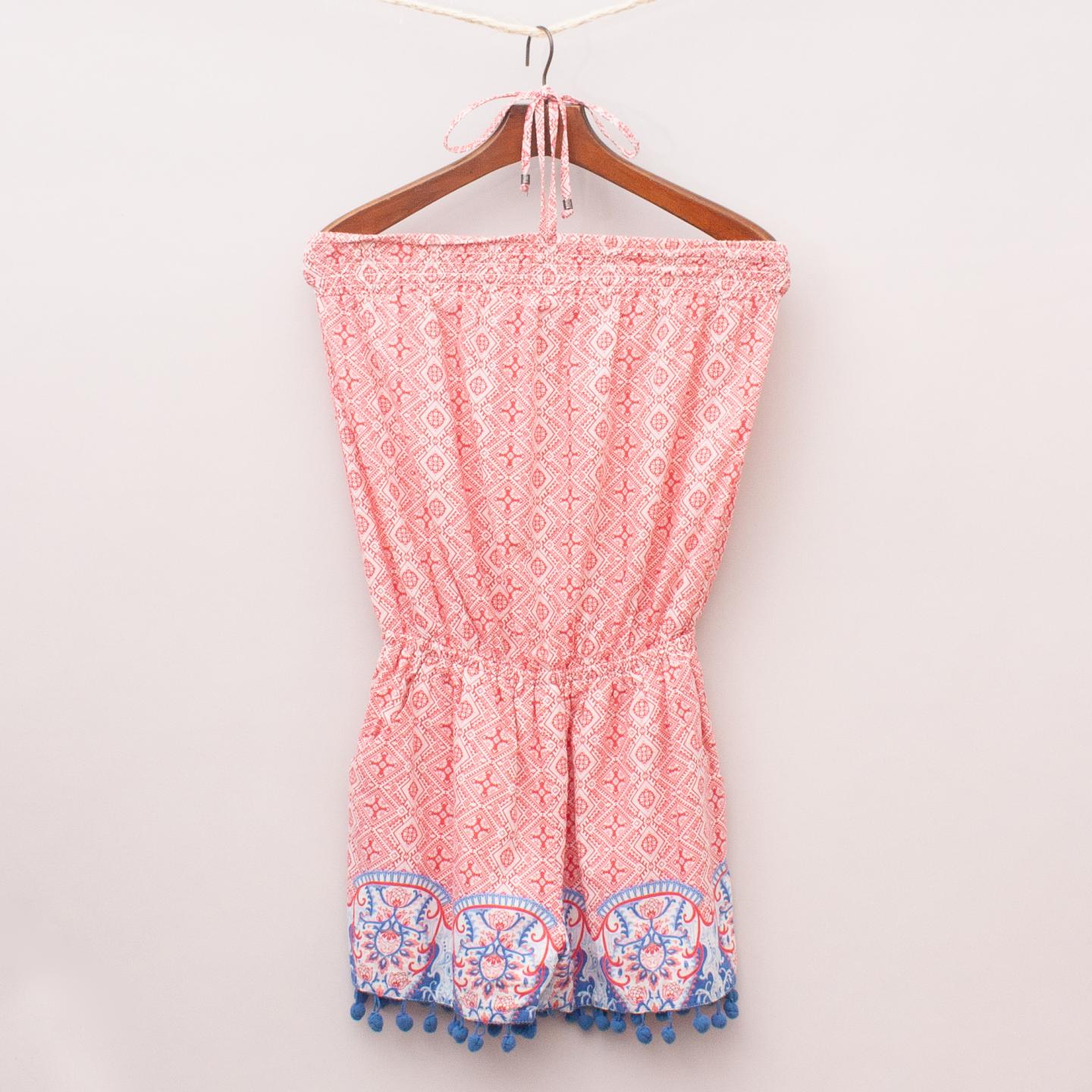Gumboots red and white patterned playsuit with two front pockets, elastic waistband, blue patterned and pom pom trim hemline with elastic neckline and tie up closure *100% Cotton