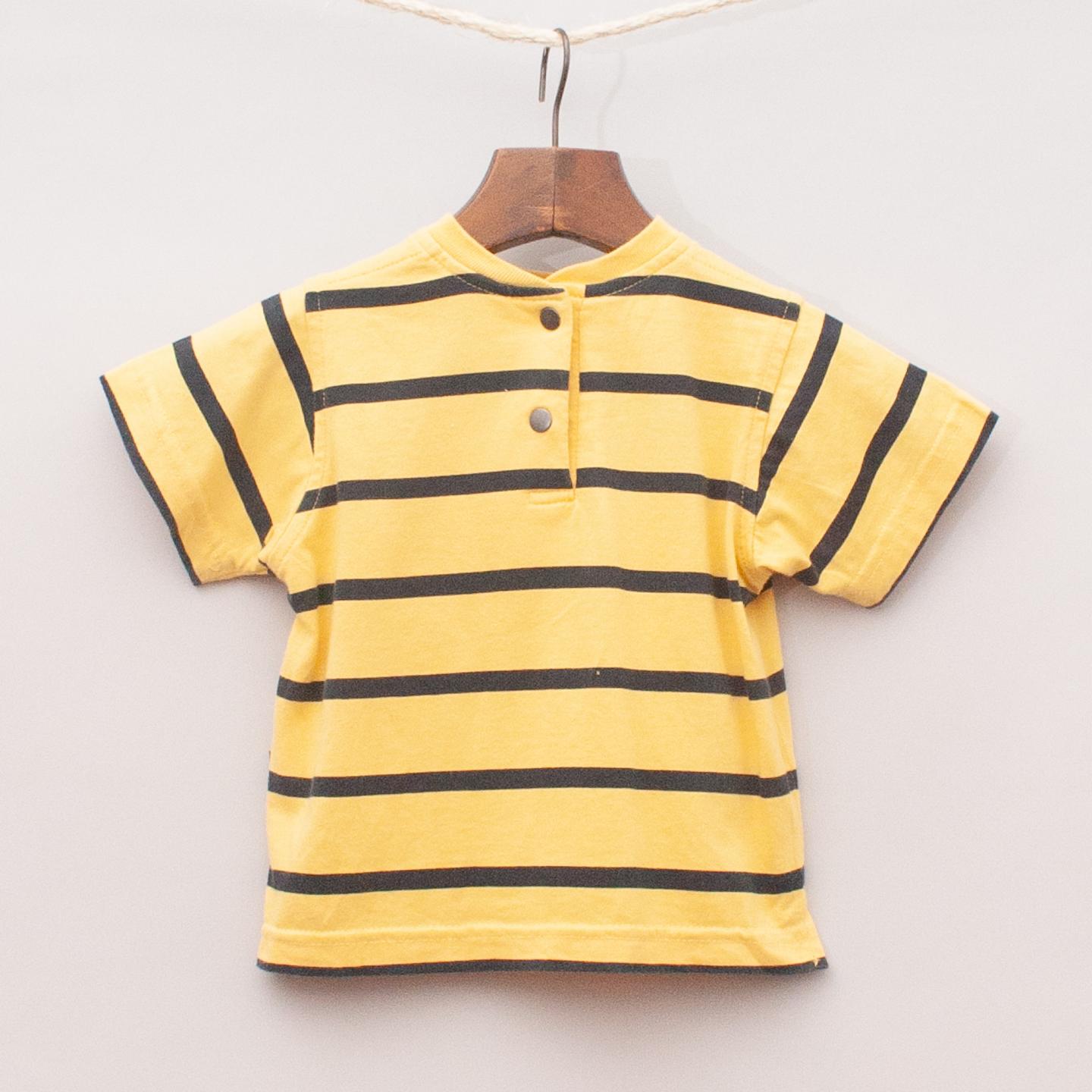 Gumboots yellow and navy blue striped t-shirt with printed logo on the front and button back closure