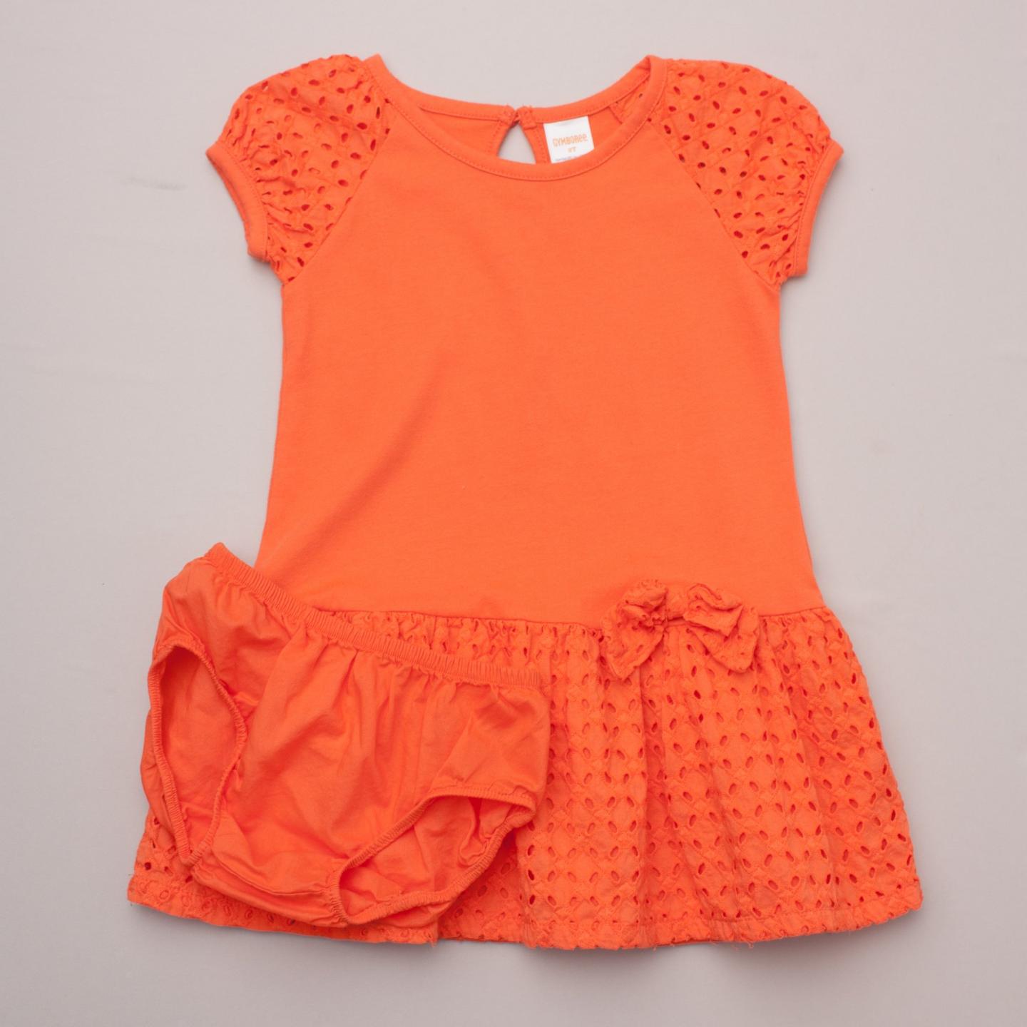 Gymboree bright orange dress with broderie anglais sleeves and ruffled hemline with bow detail, single button back and matching orange bloomers