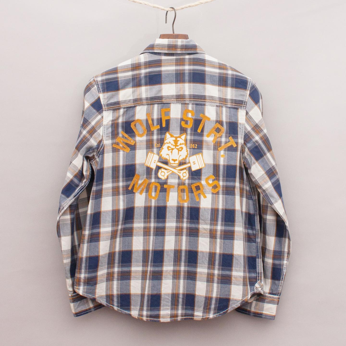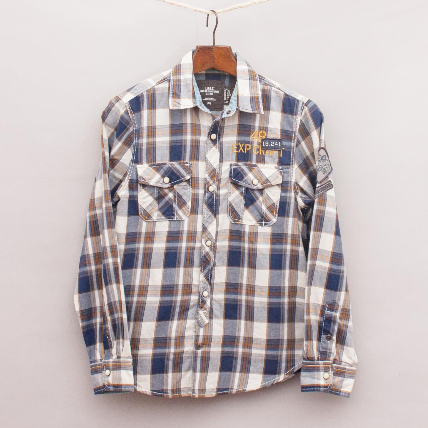 H&M mustard, blue and stone coloured check long sleeve shirt with two front pockets, embroidered logo and pearl dome buttons throughout