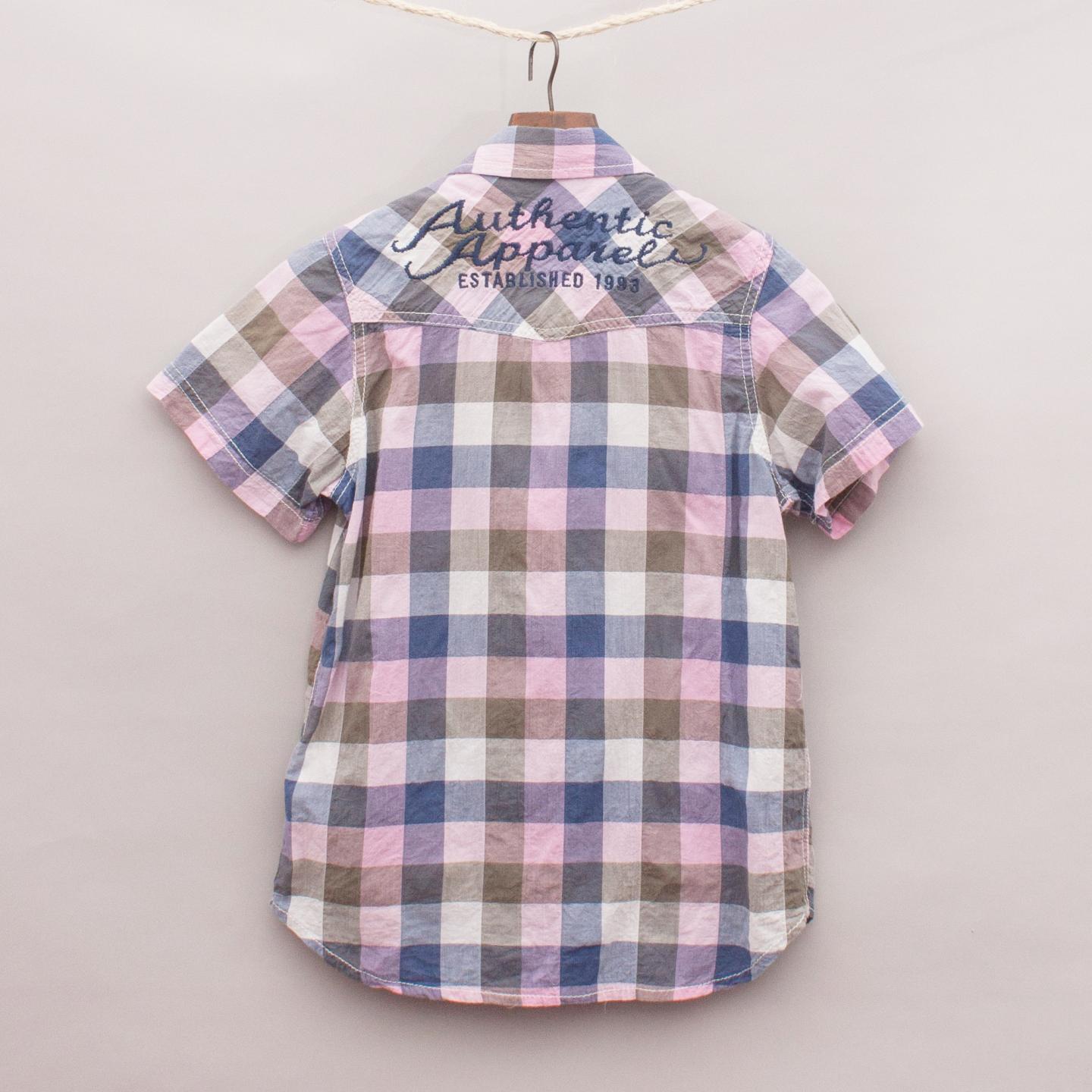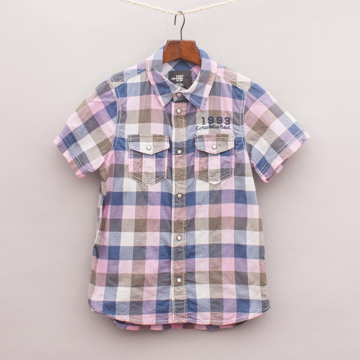 H&M blue, pink and white check short sleeve shirt with two pocket front, embroidered logo and pearl dome buttons throughout