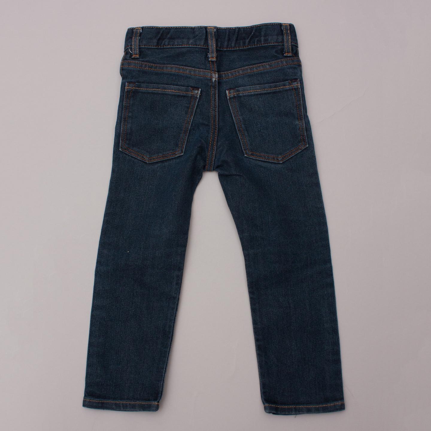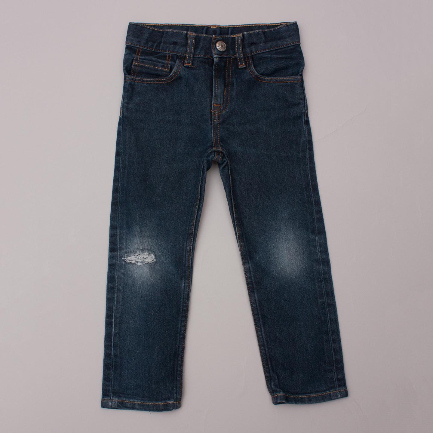 H&M dark wash distressed denim jeans with front and back pockets, belt loops and button/zip fastening