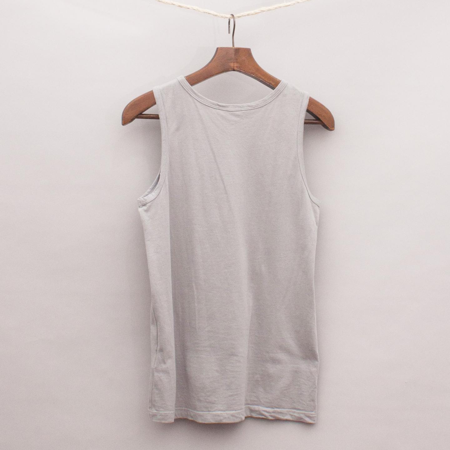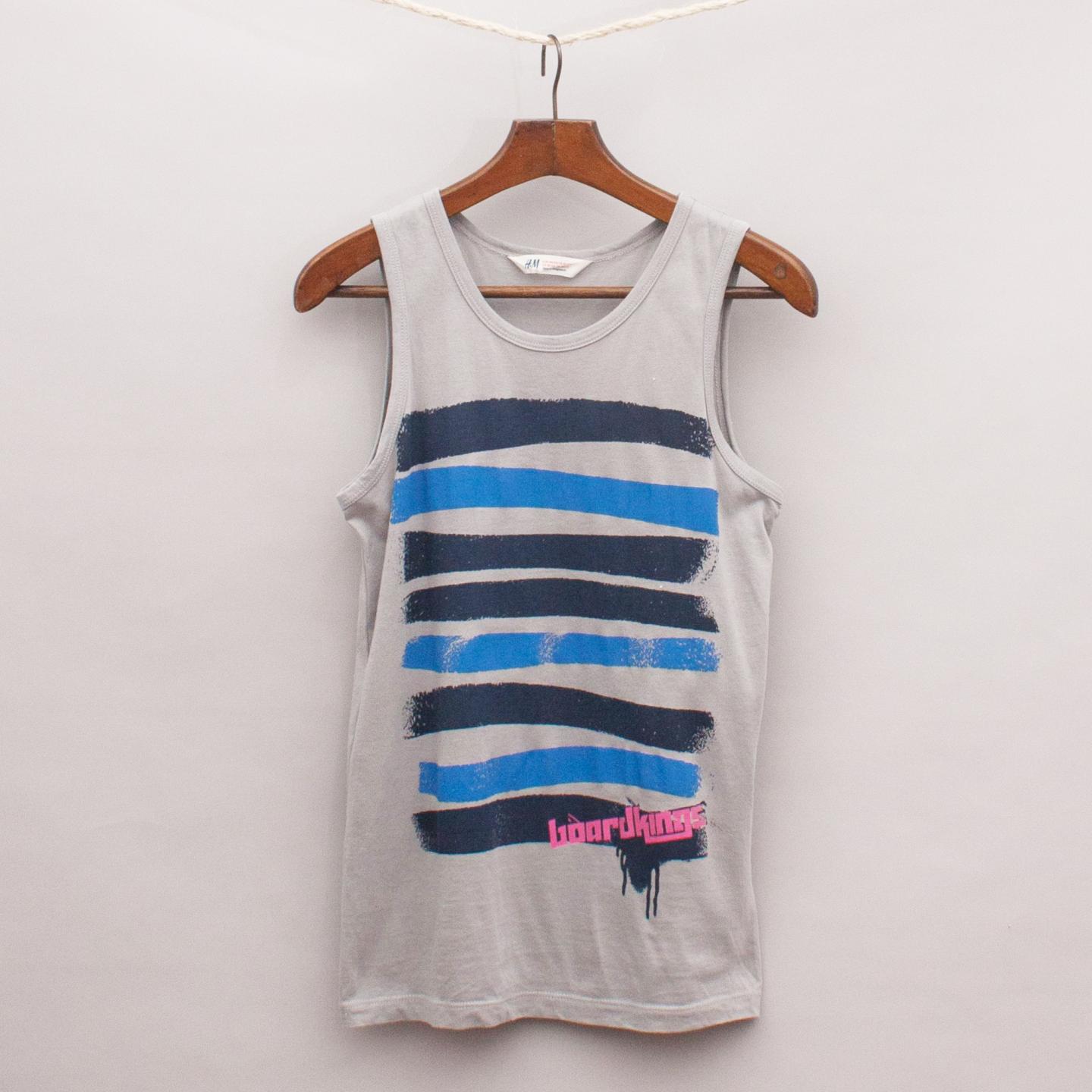 H&M grey singlet with blue printed stripes on the front and pink slogan on the bottom