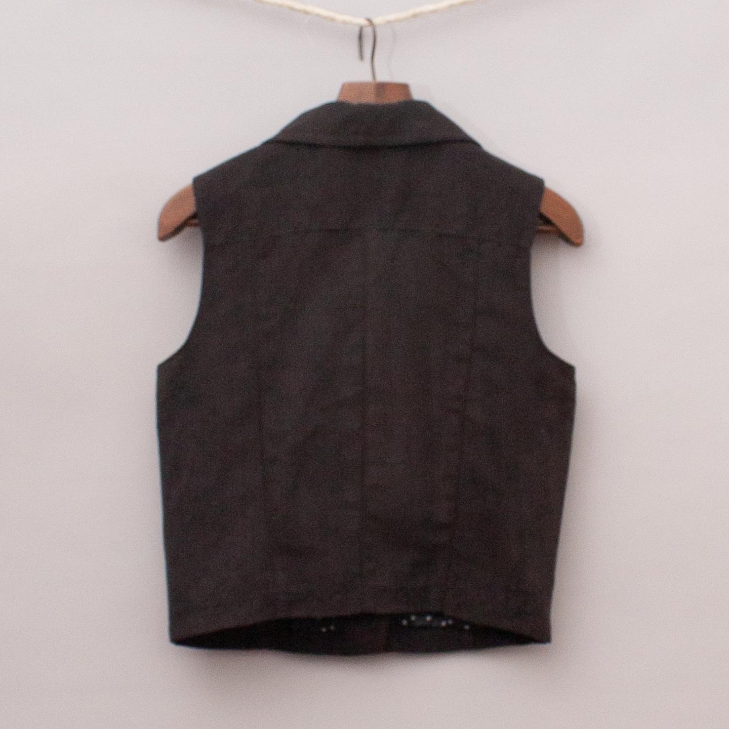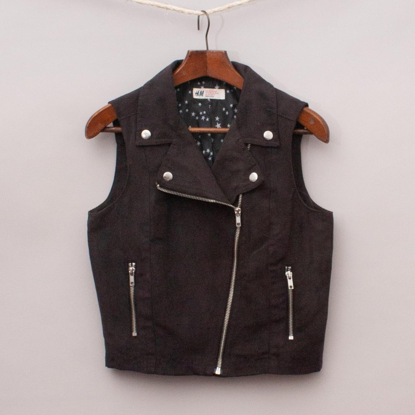 H&M black faux suede vest with two front pockets, detailed button collar and angled zip closure