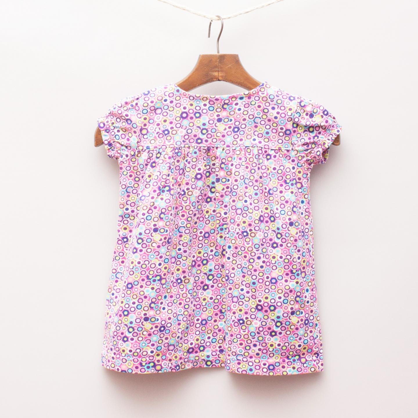 Hanna Anderson pink, purple and multi coloured circle print smock top with gathered puffed sleeves and two button detail on the front