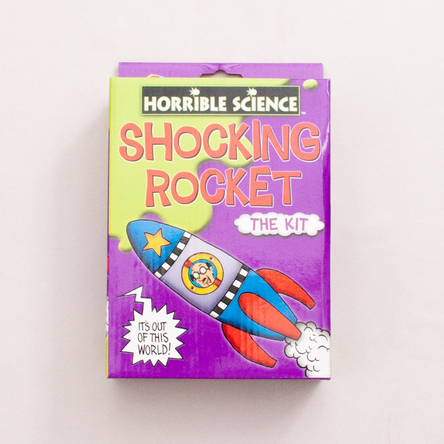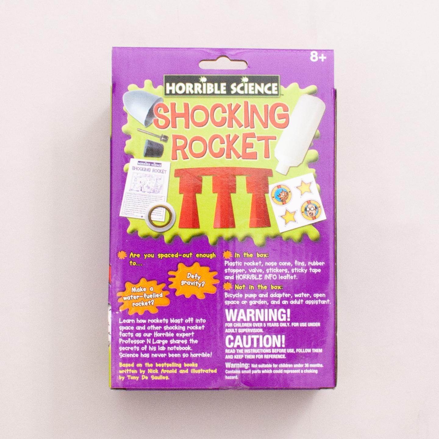Horrible Science Shocking Rocket kit includes; plastic rocket, nose cone, fins, rubber stopper, valve, stickers, sticky tape and horrible info leaflet - Suitable for 8+