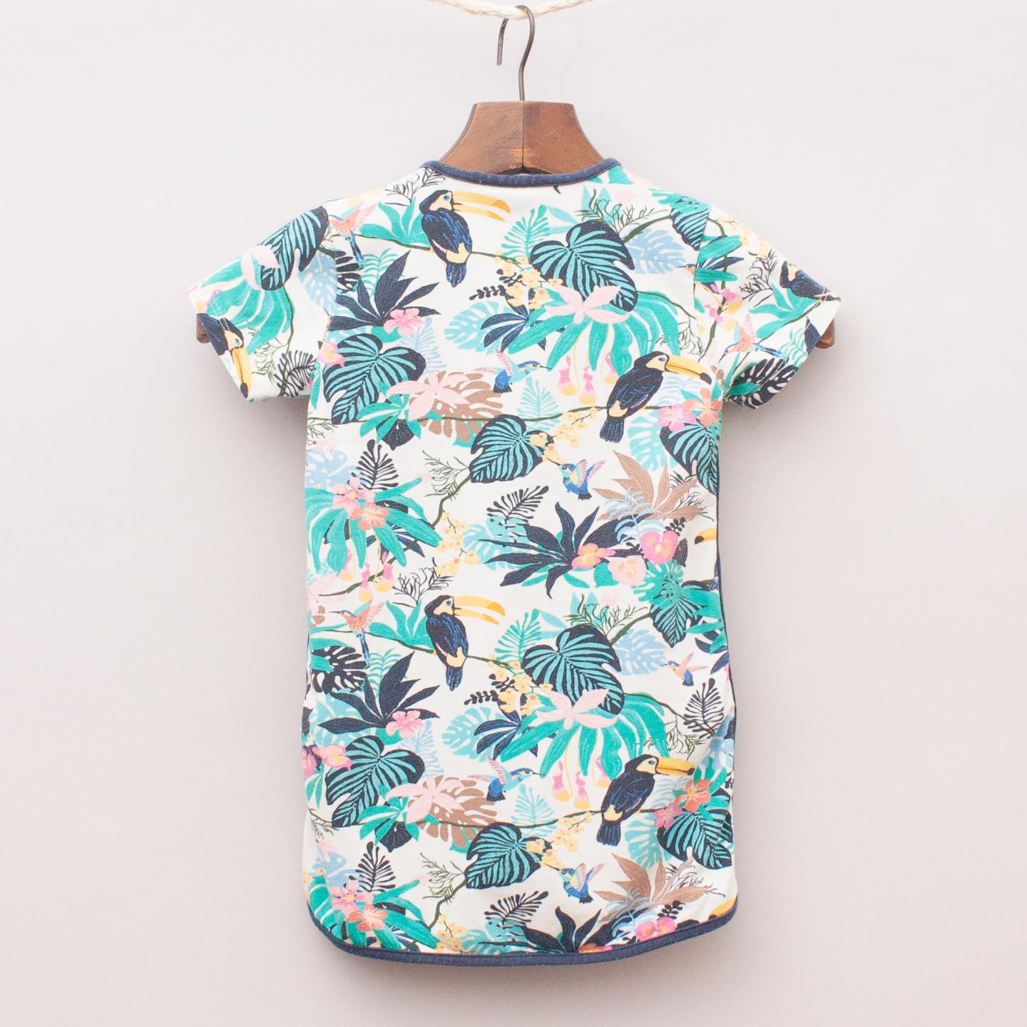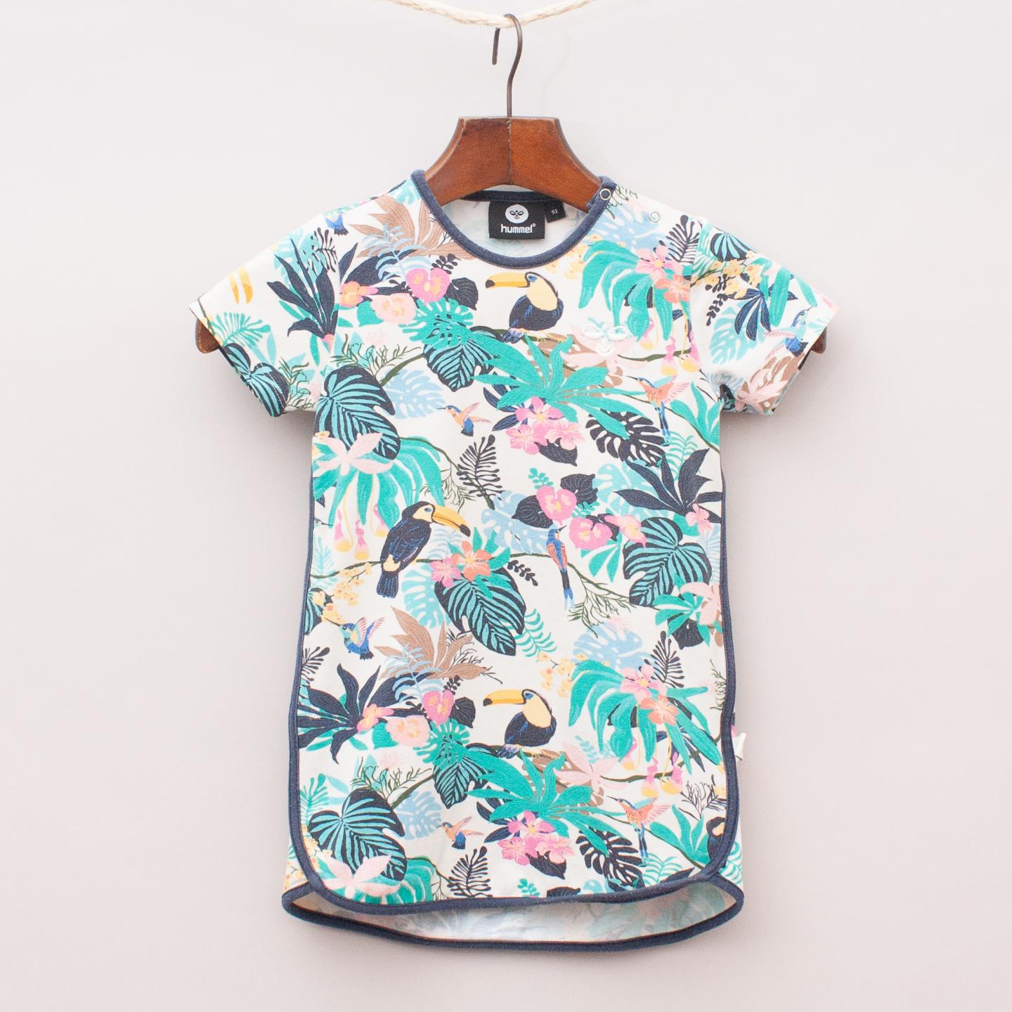 Hummel rainforest patterned t-shirt dress with navy blue trim and embroidered logo on the front