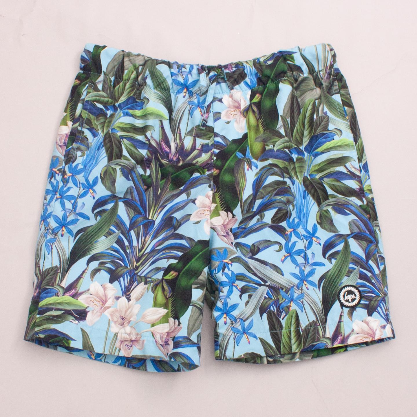 Hype Kids blue and green jungle and floral patterned board shorts with front and back pockets, elastic waistband and drawstring *100% Polyester
