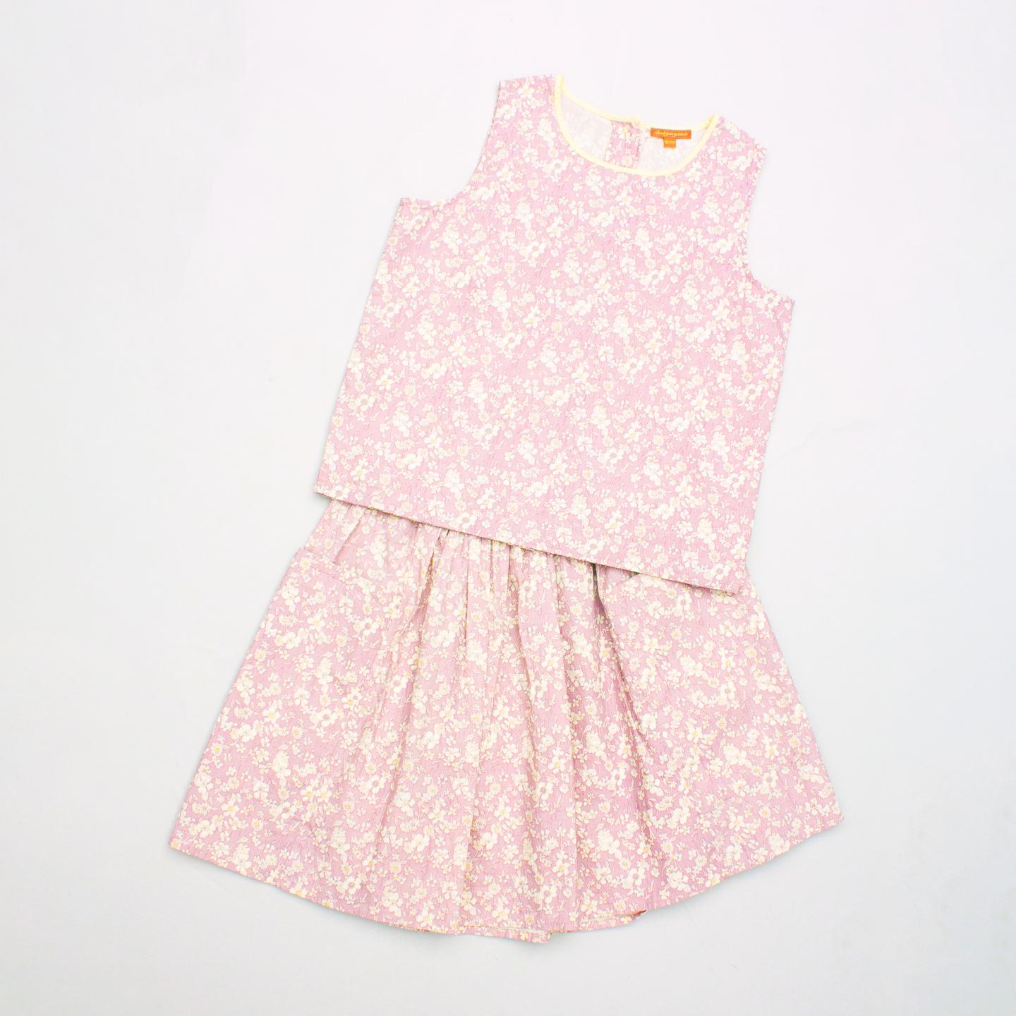 I Love Gorgeous pastel purple and floral patterned top and skirt set with two pockets, gathered and elastic waistband and yellow trim detail