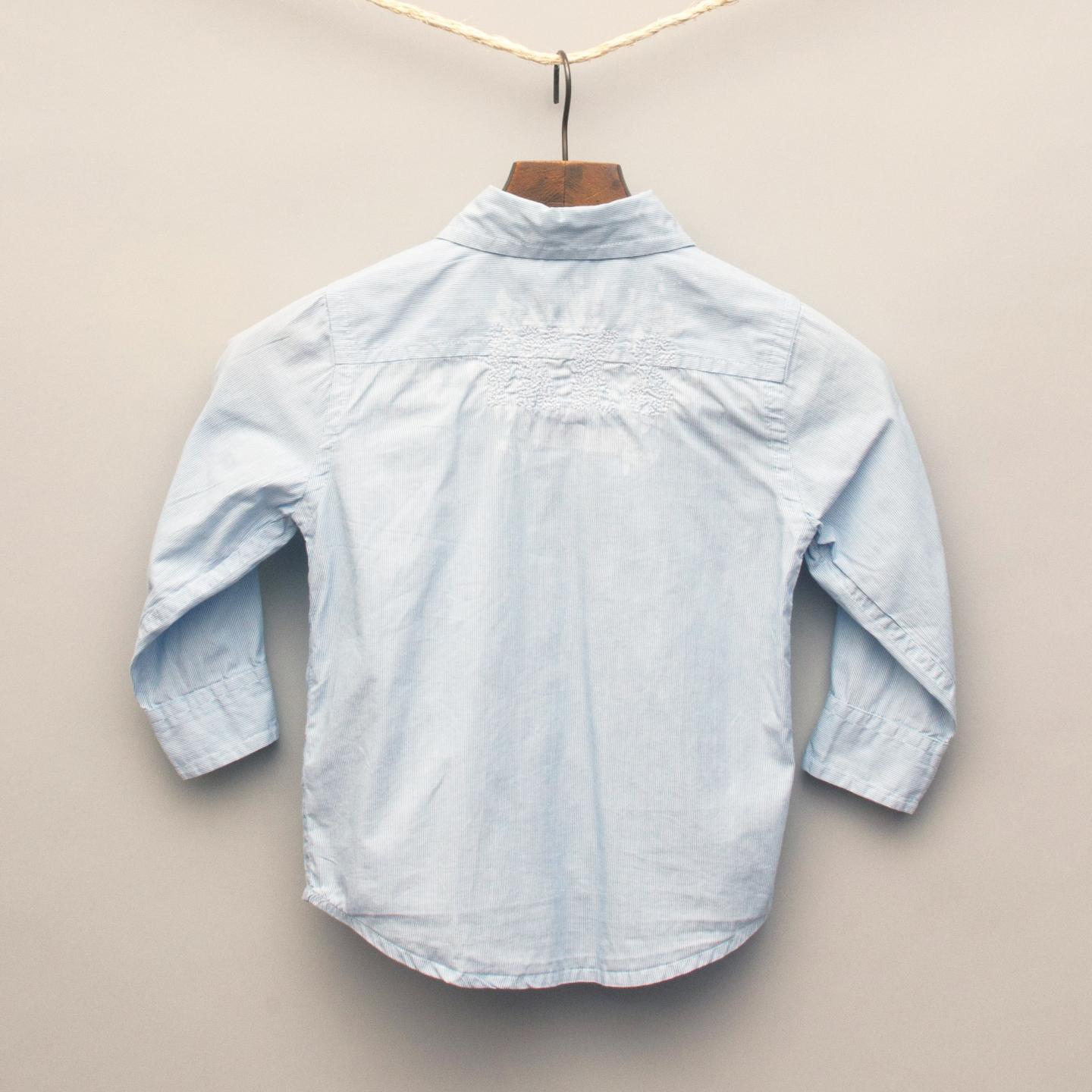IKKS blue pin stripe shirt with single front pocket, embroidered IKKS on back and bib style stitching detail on front