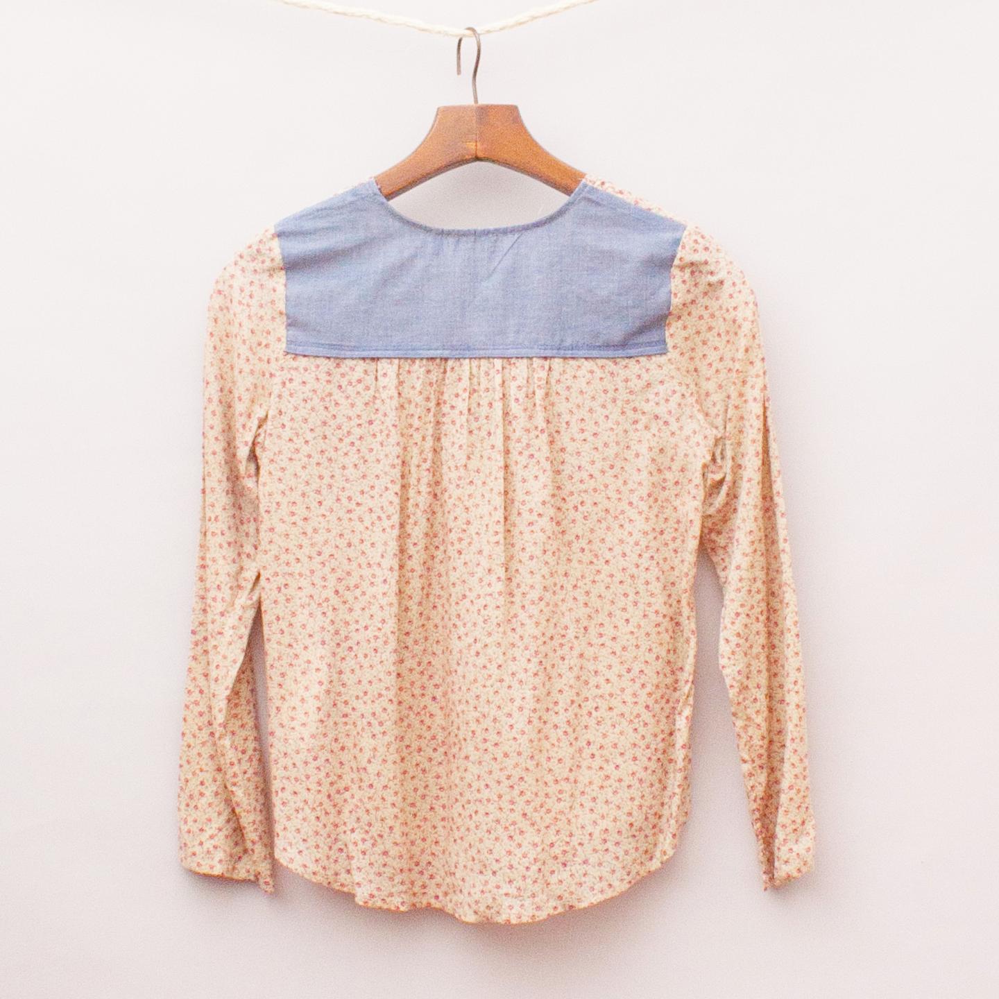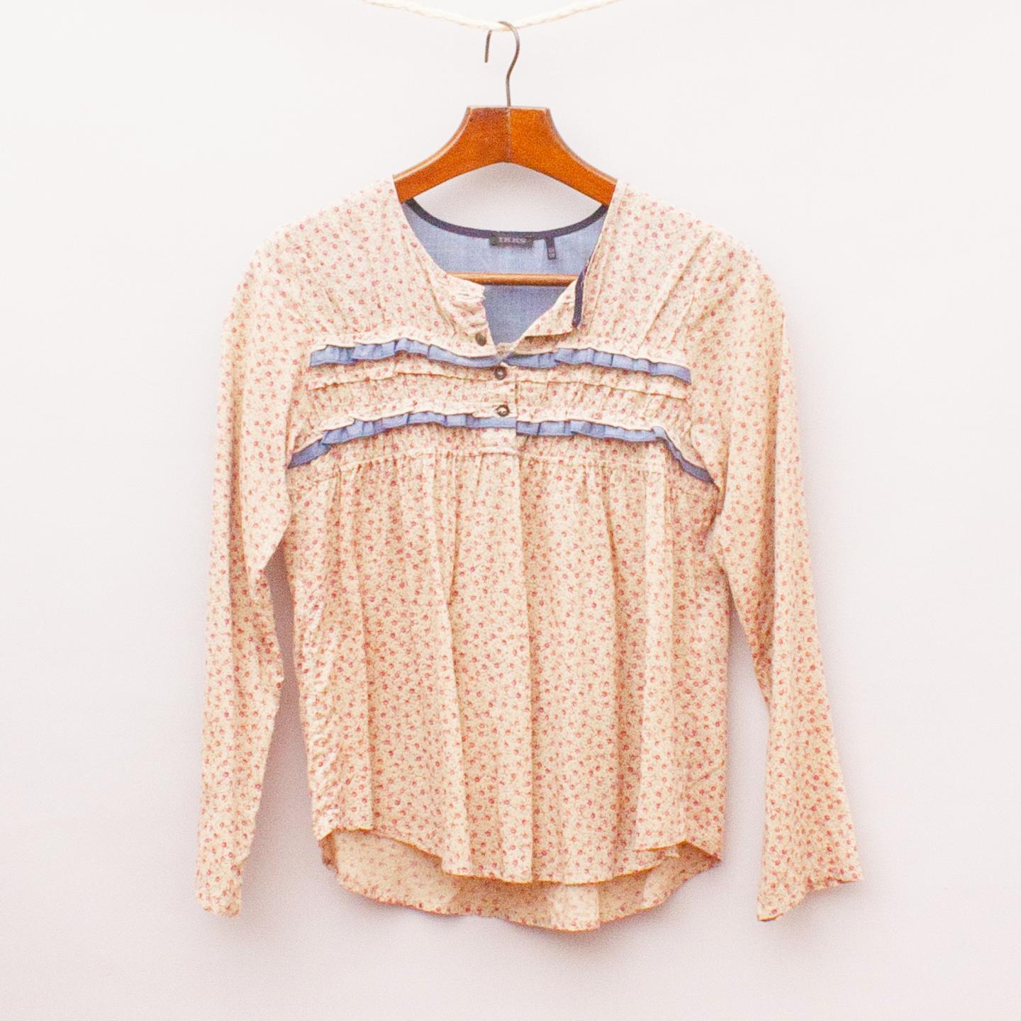IKKS light brown and floral print long sleeve blouse with blue ruffle detail, gathered chest and button down front