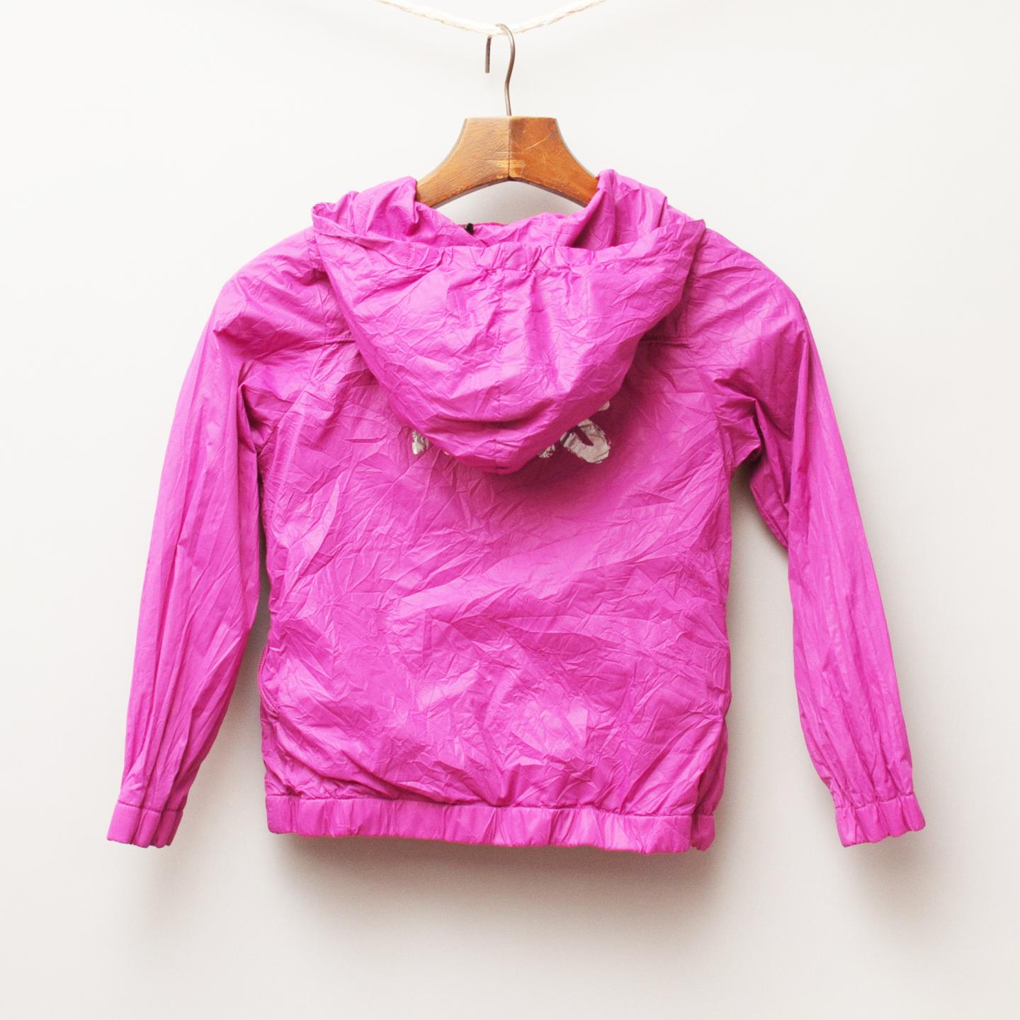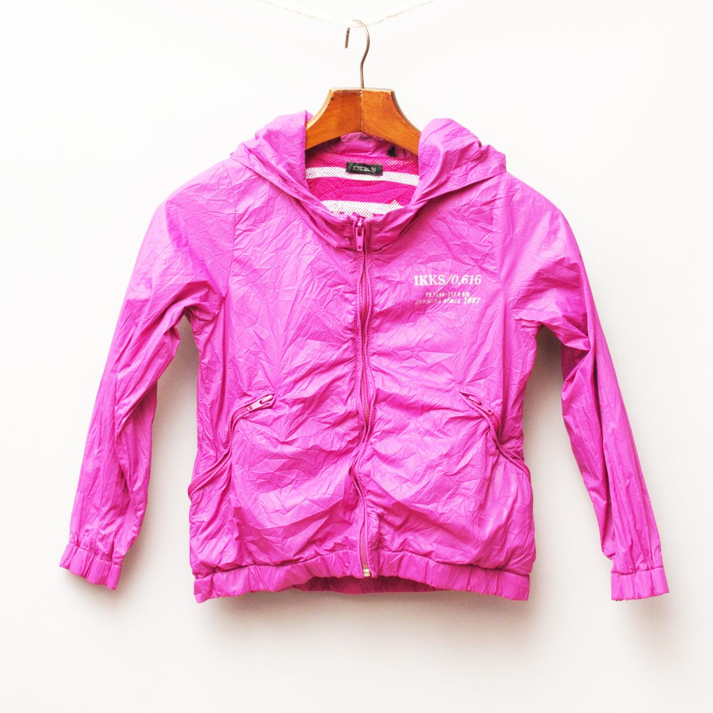 IKKS fuchsia coloured sports style jacket with silver writing on front and back, two pocket detail, hood and zip up fastening
