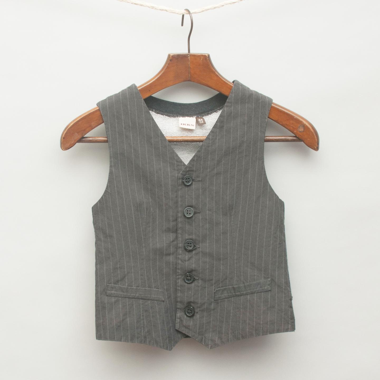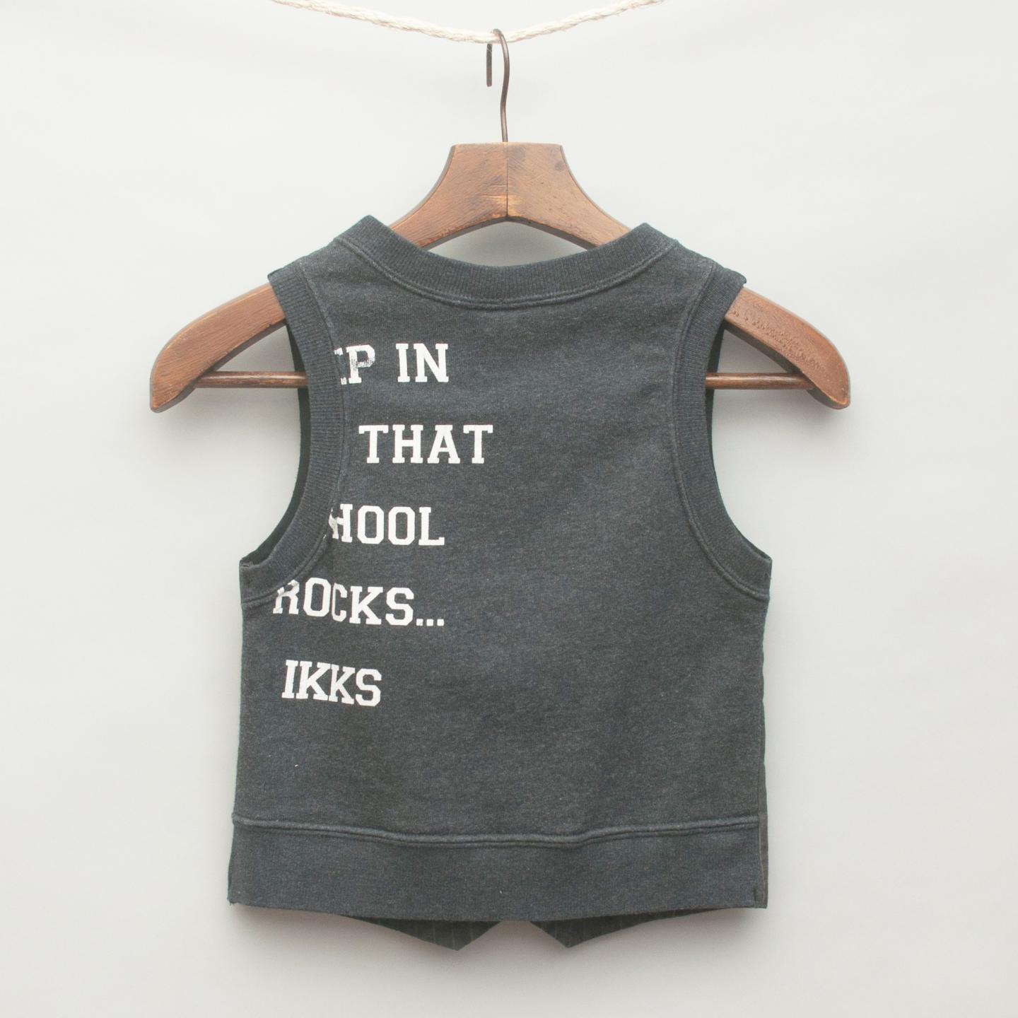 IKKS grey pin stripe vest with sweater style back and printed words, two pockets on front and full button fastening