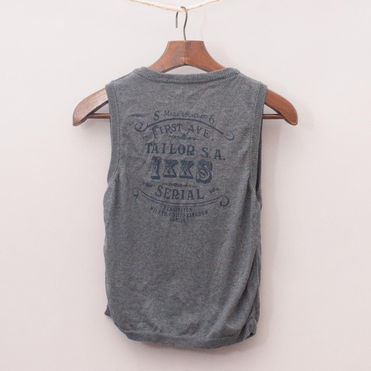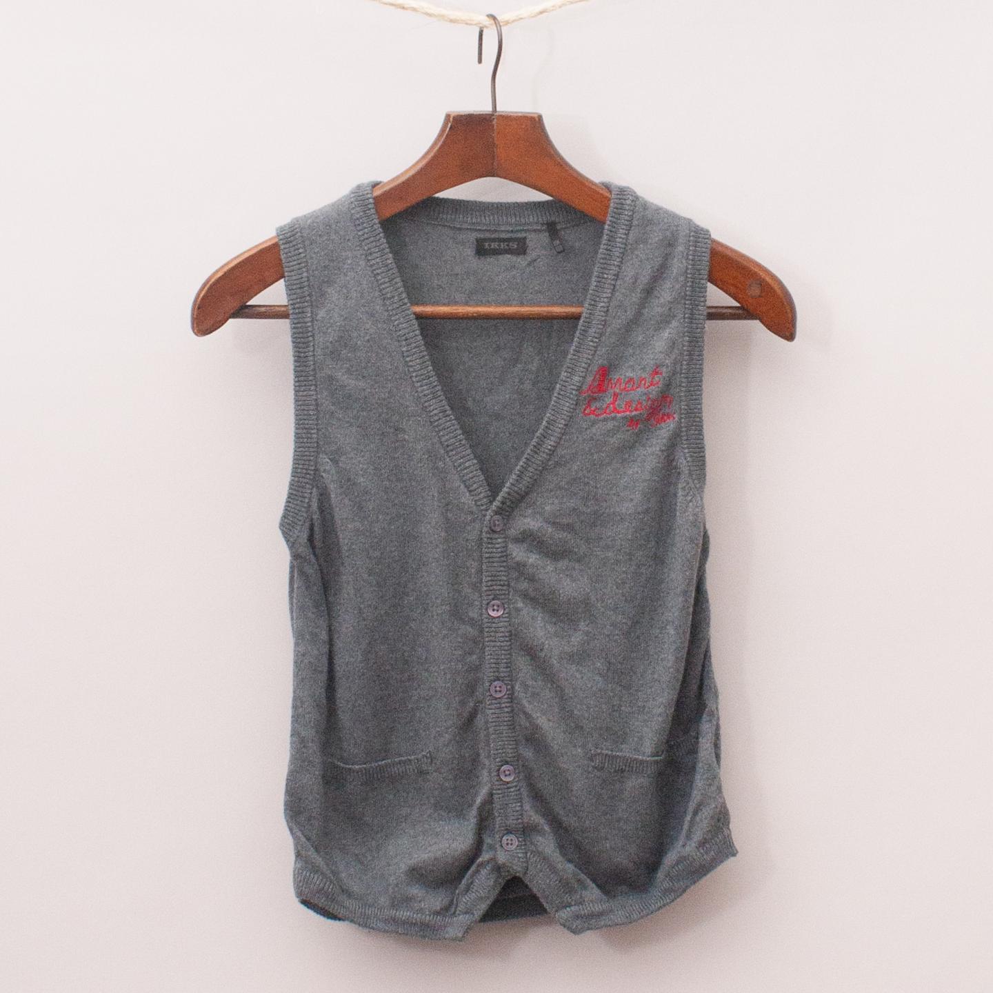 IKKS grey knit vest with two front pockets, embroidered detail, printed words on the back and button down front *100% Cotton