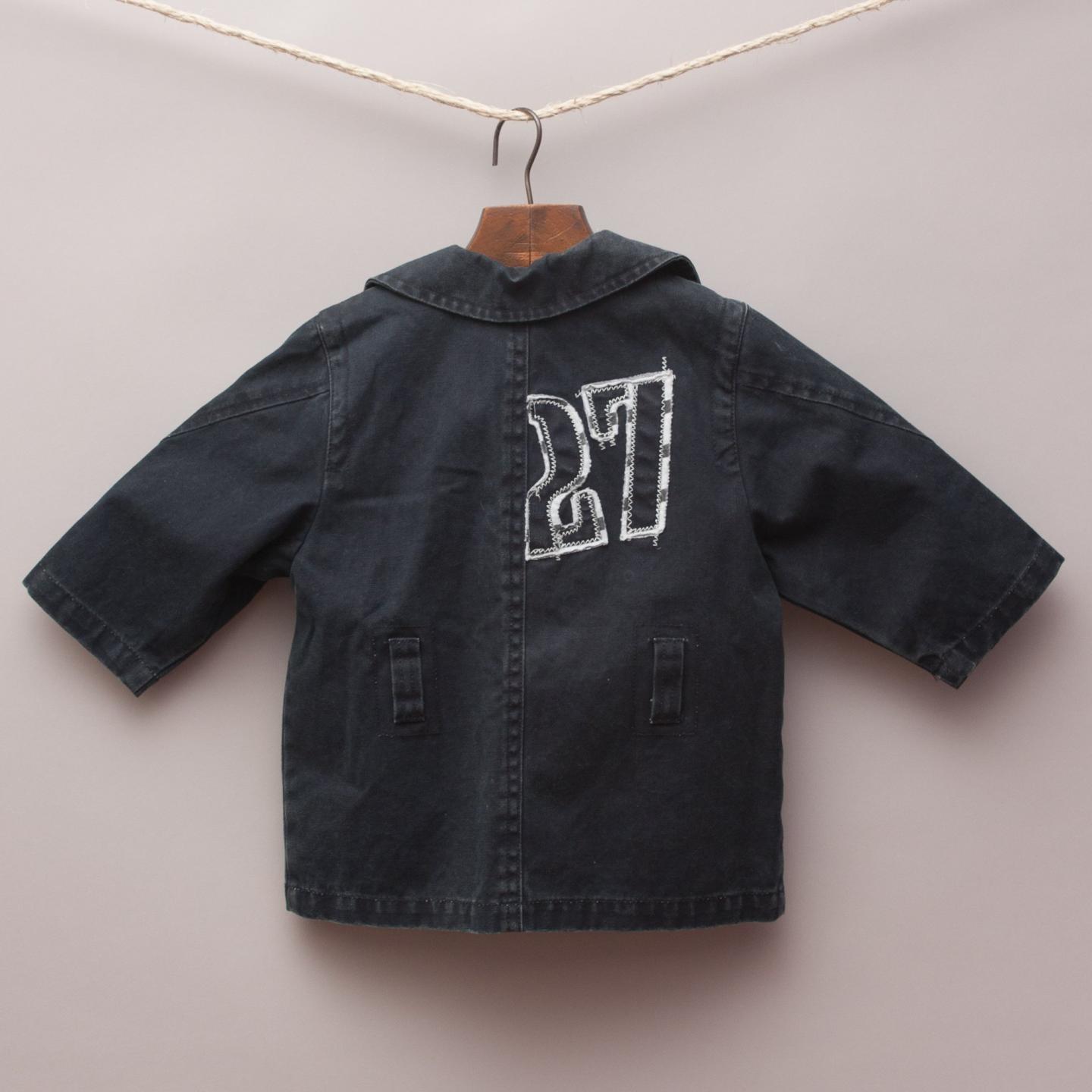 IKKS "brand new with tags" distressed navy blue military style jacket with two front pockets, cross over buttons and wide collar