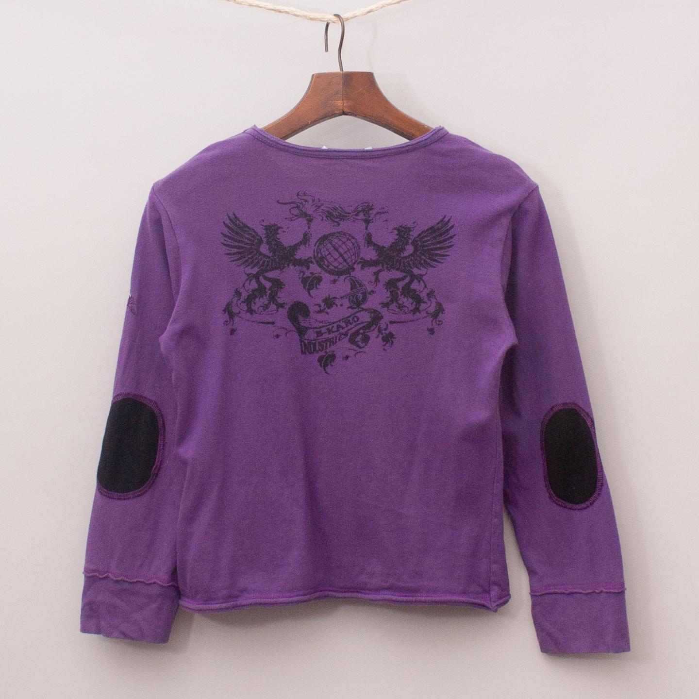 IKKS purple long sleeve top with elbow patches, small v-neck and raw edge detail *100% Cotton