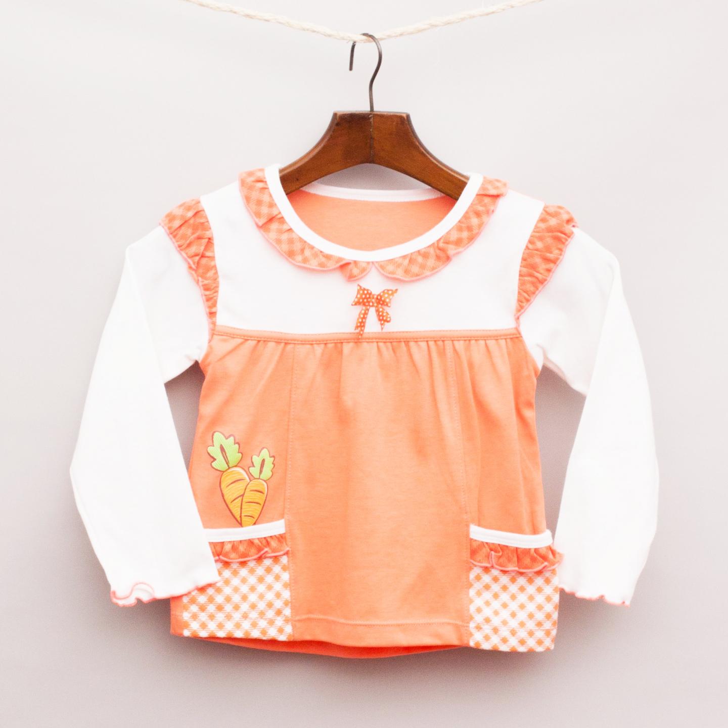 Ikavou "brand new with tags" white and orange long sleeve top with orange checked collar and trim details, printed carrots on the front and two front pockets